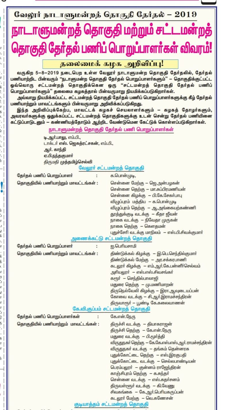 வேலூர் நாடாளுமன்ற தொகுதிக்கான தேர்தல் பணிப் பொறுப்பாளர்களும், சட்டமன்ற வாரியான பொறுப்பாளர்களும் அறிவிக்கப்பட்டுள்ளனர்.