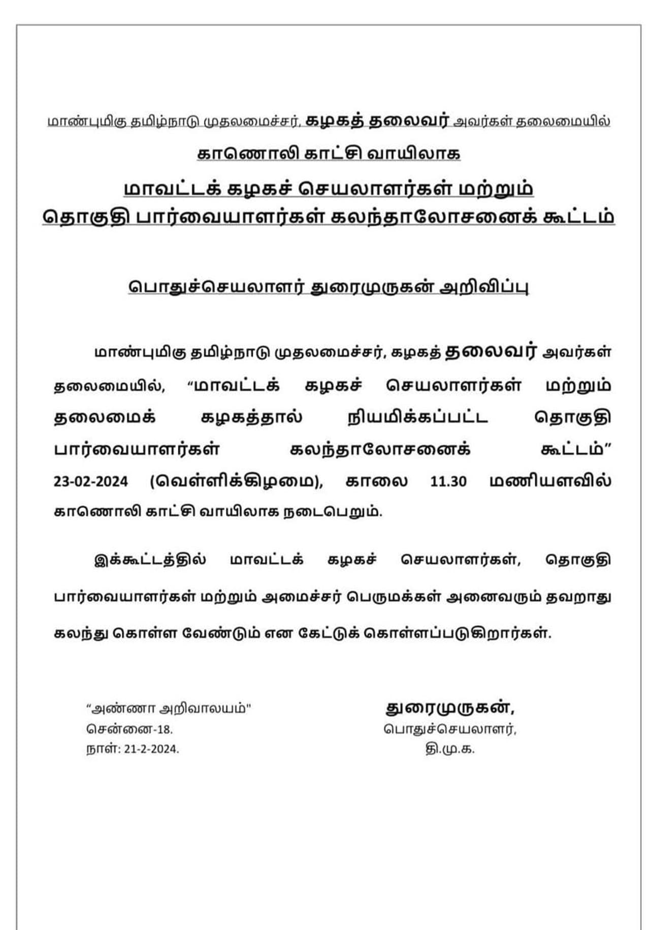 இந்த பரபரப்பான சூழ்நிலையில் திமுக மாவட்ட செயலாளர்கள் மற்றும் தொகுதி பார்வையாளர்கள் கூட்டத்திற்கு அழைப்பு விடுக்கப்பட்டுள்ளது. நாளை காலை(23.02.2024) முதலமைச்சர் ஸ்டாலின் தலைமையில் இந்த ஆலோசனை கூட்டம் நடைபெறவுள்ளதாக அறிவிக்கப்பட்டுள்ளது. இந்த கூட்டத்தில் மாவட்ட செயலாளர்கள், தொகுதி பார்வையாளர்கள், அமைச்சர்கள் கலந்து கொள்ள வேண்டும் என தெரிவிக்கப்பட்டுள்ளது. இந்த கூட்டத்தில் கூட்டணி கட்சிகளுக்கு தொகுதி பங்கீடு, வெற்றி வாய்ப்பு நிலவரம் தொடர்பாக ஆலோசிக்கப்படவுள்ளதாக தகவல் வெளியாகியுள்ளது.