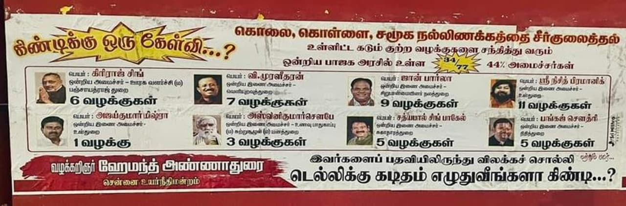 இது போன்ற மத்திய அமைச்சர்களின் குற்ற வழக்கு பட்டியலை போஸ்டராக வெளியிட்டுள்ள திமுக, இவர்களைப் பதவியிலிருந்து விலக்கச் சொல்லி டெல்லிக்கு கடிதம்எழுதுவீங்காள என கேள்வி எழுப்பப்பட்டுள்ளது. சென்னையின் பல்வேறு இடங்களில் திமுக வழக்கறிஞர் சார்பாக ஒட்டப்பட்டுள்ள போஸ்டர் பரபரப்பு ஏற்படுத்தியுள்ளது.