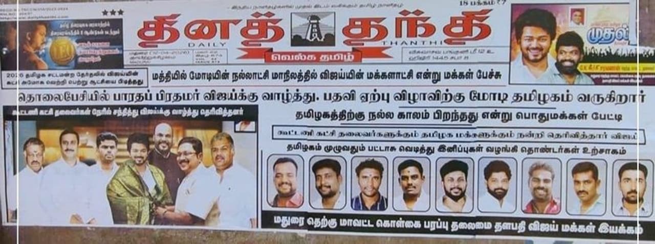 தொலைபேசியில் பாரதப் பிரதமர் விஜய்க்கு வாழ்த்து, பதவி ஏற்பு விழாவிற்கு மோடி தமிழகம் வருகிறார். தமிழகத்திற்கு நல்ல காலம் பிறந்தது என்று பொதுமக்கள் பேட்டி. கூட்டணி கட்சித் தலைவர்களும் தமிழக மக்களும் நன்றி தெரிவித்தார் விஜய். தமிழக முழுவதும் பட்டாசு வெடித்து இனிப்பு வழங்கி தொண்டர்கள் கொண்டாட்டம் என அந்த போஸ்டரில் அச்சடிக்கப்பட்டுள்ளது. அதில் இடம்பெற்றுள்ள புகைப்படத்தில் நடிகர் விஜய்க்கு பாஜக மாநில தலைவர் அண்ணாமலை, ஓ பன்னீர்செல்வம், பாமக தலைவர் அன்புமணி, ஜான்பாண்டியன், டிடிவி தினகரன், ஜிகே வாசன் ஆகியோர் வாழ்த்து தெரிவிப்பது போன்ற புகைப்படமும் இடம்பெற்றுள்ளது.