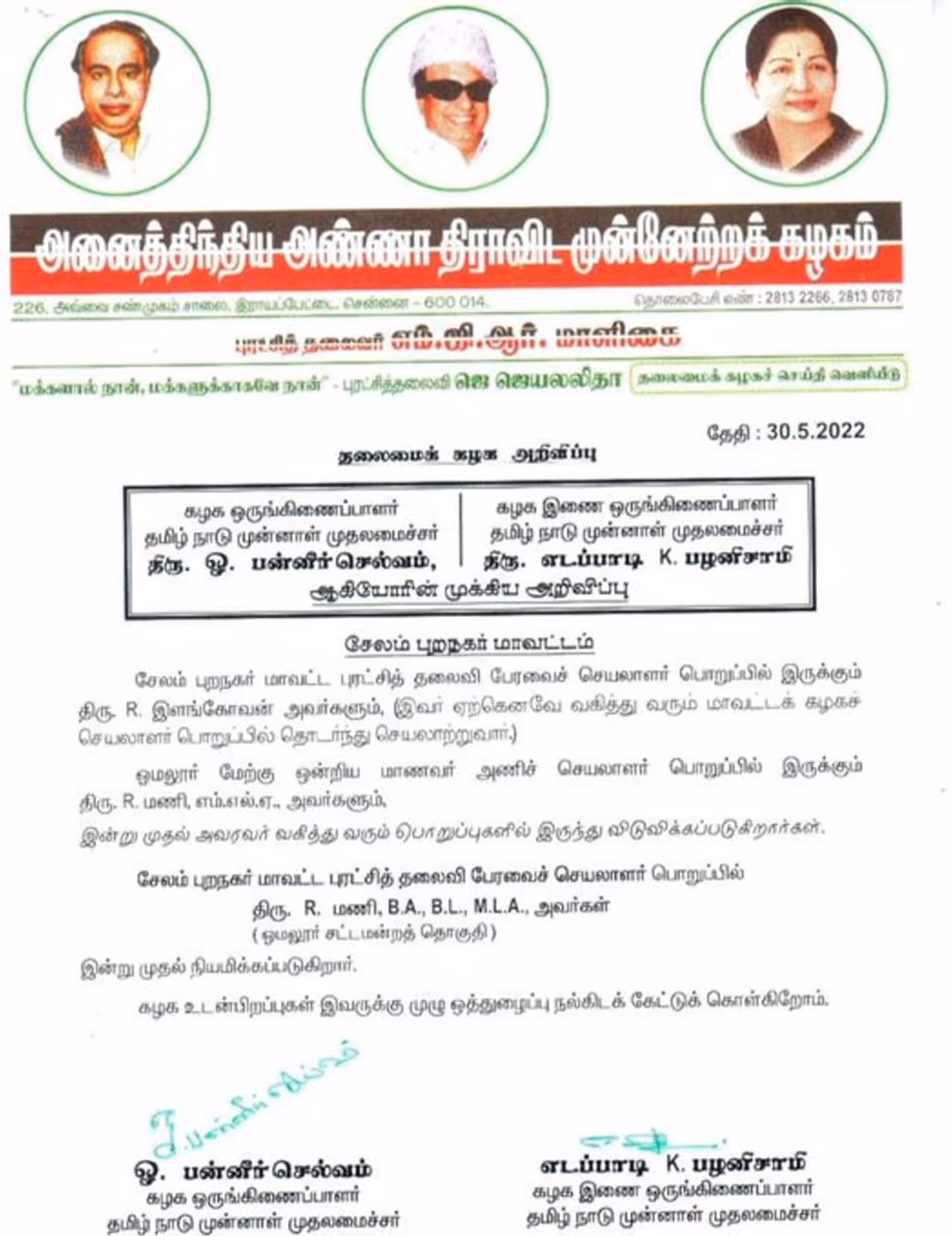 சேலம் புறநகர் மாவட்ட ஜெயலலிதா பேரவைச் செயலாளர் பொறுப்பில் ஆர்.மணி எம்.எல்.ஏ. இன்று முதல் நியமிக்கப்படுகிறார். கழக உடன்பிறப்புகள் இவருக்கு முழு ஒத்துழைப்பு நல்கிடக் கேட்டுக்கொள்கிறோம் என தெரிவித்துள்ளனர்.
