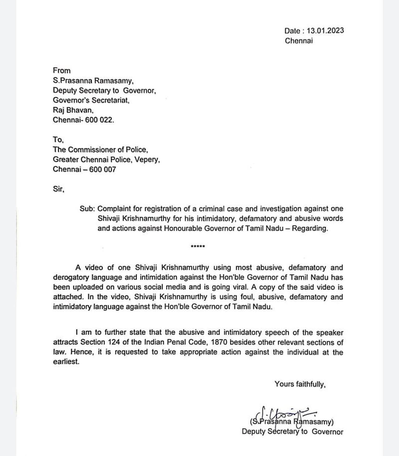 விருகம்பாக்கத்தில் நடந்த திமுக கூட்டத்தில் ஆளுநர் ஆன்.என்.ரவி பற்றி சிவாஜி கிருஷ்ணமூர்த்தி அவதூறாக பேசியதை அடுத்து அவர் மீது ஆளுநர் மாளிகை சார்பில் புகார் அளிக்கப்பட்டுள்ளது.
