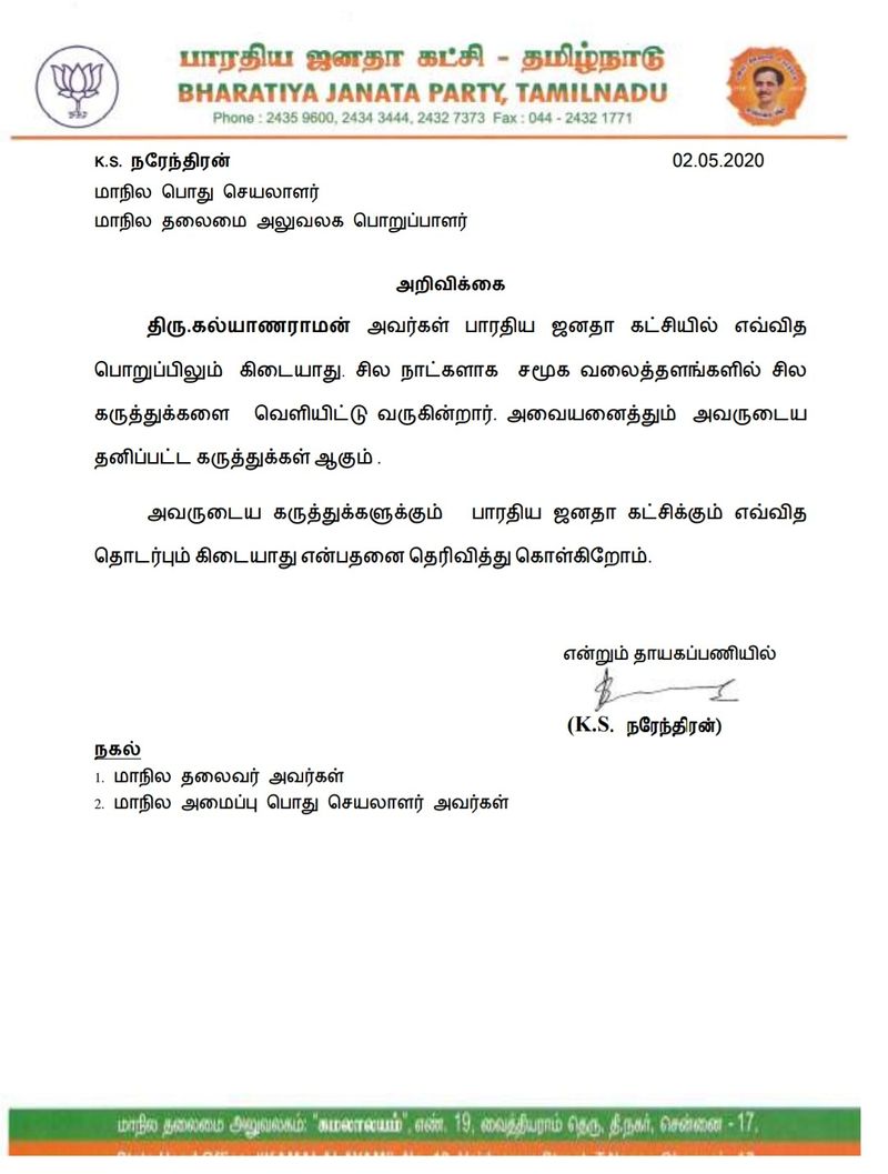 இதுகுறித்து பாஜக மாநில பொது செயலாளர் நரேந்திரன் வெளியிட்டுள்ள அறிக்கையில், ‘’ கல்யாணராமன் பாஜகவில் எந்த பொறுப்பிலும் கிடையாது. சில நாட்களாக சமூக வலைதளங்களில் சில கருத்துக்களை வெளியிட்டு வருகிறார். அவையனைத்தும் அவருடைய சொந்த கருத்துகள். அவருக்கும் பாஜகவுக்கு எந்த விதமான தொடர்பும் கிடையாது’’ என அறிவித்துள்ளார்.