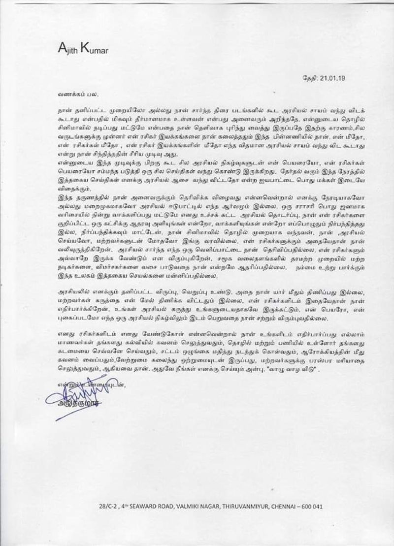 அரசியலில் எனக்கும் தனிப்பட்ட விருப்பு வெறுப்பு உண்டு அதை நான் யார் மீதும் திணிப்பதில்லை. மற்றவர்கள் கருத்தை என் மேல் திணிக்க விட்டதுமில்லை. ரசிகர்களிடம் இதைத்தான் நான் எதிர்பார்க்கிறேன். உங்கள் அரசியல் கருத்து உங்களுடையதாக இருக்கட்டும். என் பெயரையும் புகைப்படமோ எந்த ஒரு அரசியல் நிகழ்வுகளிலும் இடம் பெறுவதை நான் சற்றும் விரும்பவில்லை. எனது ரசிகர்களிடம் எனது வேண்டுகோள் என்னவென்றால் நான் உங்களிடம் எதிர்பார்ப்பது எல்லாம் மாணவர்கள் தங்களது கல்வியில் கவனம் செலுத்துவதும் தொழில் மற்றும் பணியில் உள்ளோர் தங்களது கடமையை செவ்வனே செய்வதும் சட்டம் ஒழுங்கை மதித்து நடந்து கொள்வதும் ஆரோக்கியத்தின் மீது கவனம் வைப்பதும் வேற்றுமை களைந்து ஒற்றுமையுடன் இருப்பது, மற்றவர்களுக்கு பரஸ்பர மரியாதை செலுத்துவது ஆகியவை தான்.. அதுவே நீங்கள் எனக்கு செய்யும் அன்பு .வாழு வாழ விடு.