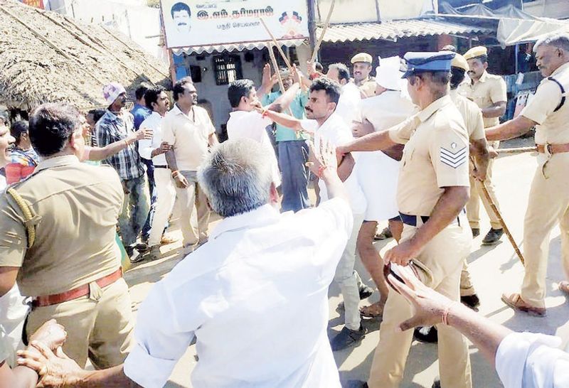 பதிலுக்கு தி.மு.க.வினரும் தாக்கினர். இதனால் இரு தரப்பினருக்குமிடையே பயங்கர மோதல் ஏற்பட்டது. இரு தரப்பினரும் கல்வீசி தாக்கிக்கொண்டனர்.