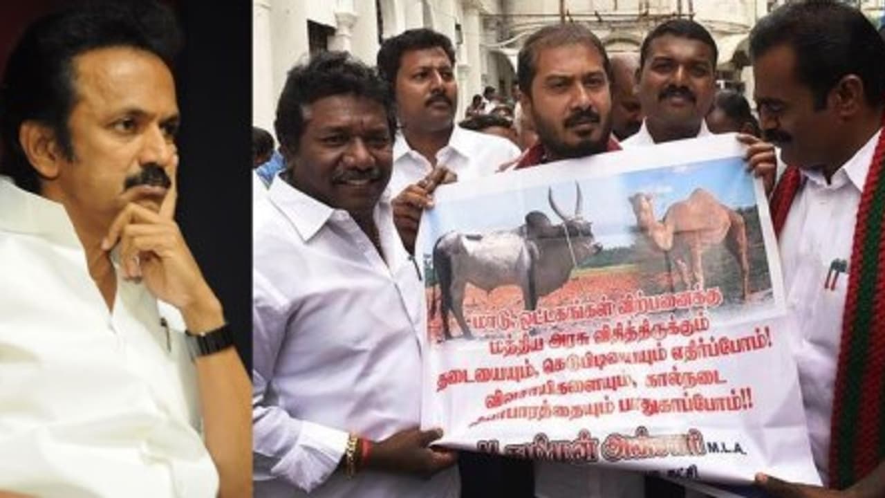 அண்மையில் மாட்டிறைச்சி குறித்து விவாதிக்க வேண்டும் என்று தமிழக சட்டமன்றத்தில் திமுகவினர் போர்க்கொடி உயர்த்தினர். கேரள, மணிப்பூரைப் போல தமிழக அரசும் தீர்மானம் நிறைவேற்றி மத்திய அரசுக்கு நெருக்கடி அளிக்க வேண்டும் என்றும்,மாட்டிறைச்சி தடை மீதான விவகாரத்தில் முதல் அமைச்சர் தனது நிலைப்பாட்டை தெரிவிக்க வேண்டும் என்றும் வலியுறுத்தினர். ஆனால் இக்கோரிக்கை நிராகரிக்கப்பட்டதால் திமுகவினர் வெளிநடப்பு செய்தனர்.