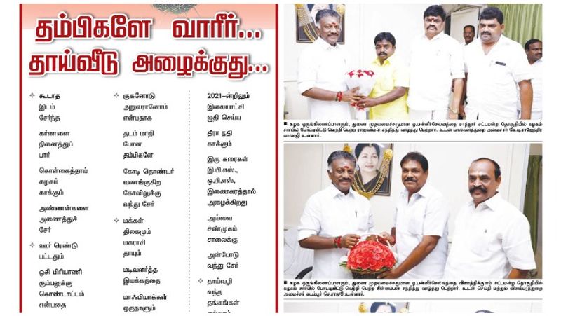 அதிமுகவின் அதிகாரப்பூர்வ நாளிதழான நமது அம்மாவில்,...தம்பிகளே வாரீர் தாய்வீடு அழைக்குது...என்ற தலைப்பில் கவிதை வெளியிடப்பட்டுள்ளது. கூடாத இடம் சேர்ந்த கர்ணனை நினைத்துப் பார் எனத் தொடங்கும் அந்த கவிதையில், ஒரு நொடியும் தாமதிக்காது உடனே வந்து கழகம் சேர் என்று அதிமுக சார்பில் அழைப்பு விடுக்கப்பட்டுள்ளது.