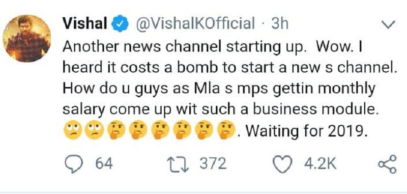 அ.தி.மு.க.வின் அதிகாரப்பூர்வ சேனலாக துவக்கப்பட்டிருக்கும் ‘நியூஸ் ஜெ’ விஷயத்தில் ட்விட்டர் வடிவில் விஷால் மூக்கை நுழைத்திருந்தார். இது பற்றி நமது ஏஸியாநெட் தமிழ் இணையதளம் நேற்றே விரிவான செய்தி வெளியிட்டிருந்தது. அந்த ட்விட்டில், ‘சேனல் துவங்க பெரும் செலவு ஆகுமென கேள்விப்பட்டிருக்கிறேன். மாத சம்பள எம்.எல்.ஏ., எம்.பி.க்களான நீங்கள் எப்படி இப்படியொரு பிஸ்னஸ் மாடலாக வெளிப்பட முடிகிறது?’ என்று கேட்டிருந்தார். விஷாலின் இந்த சென்சேஷனல் ட்விட்டுக்கு நிச்சயம் அ.தி.மு.க. தரப்பிலிருந்து அதிரடி சரவெடி ரியாக்ஷன் கிடைக்குமென எதிர்பார்க்கப்பட்டது.
