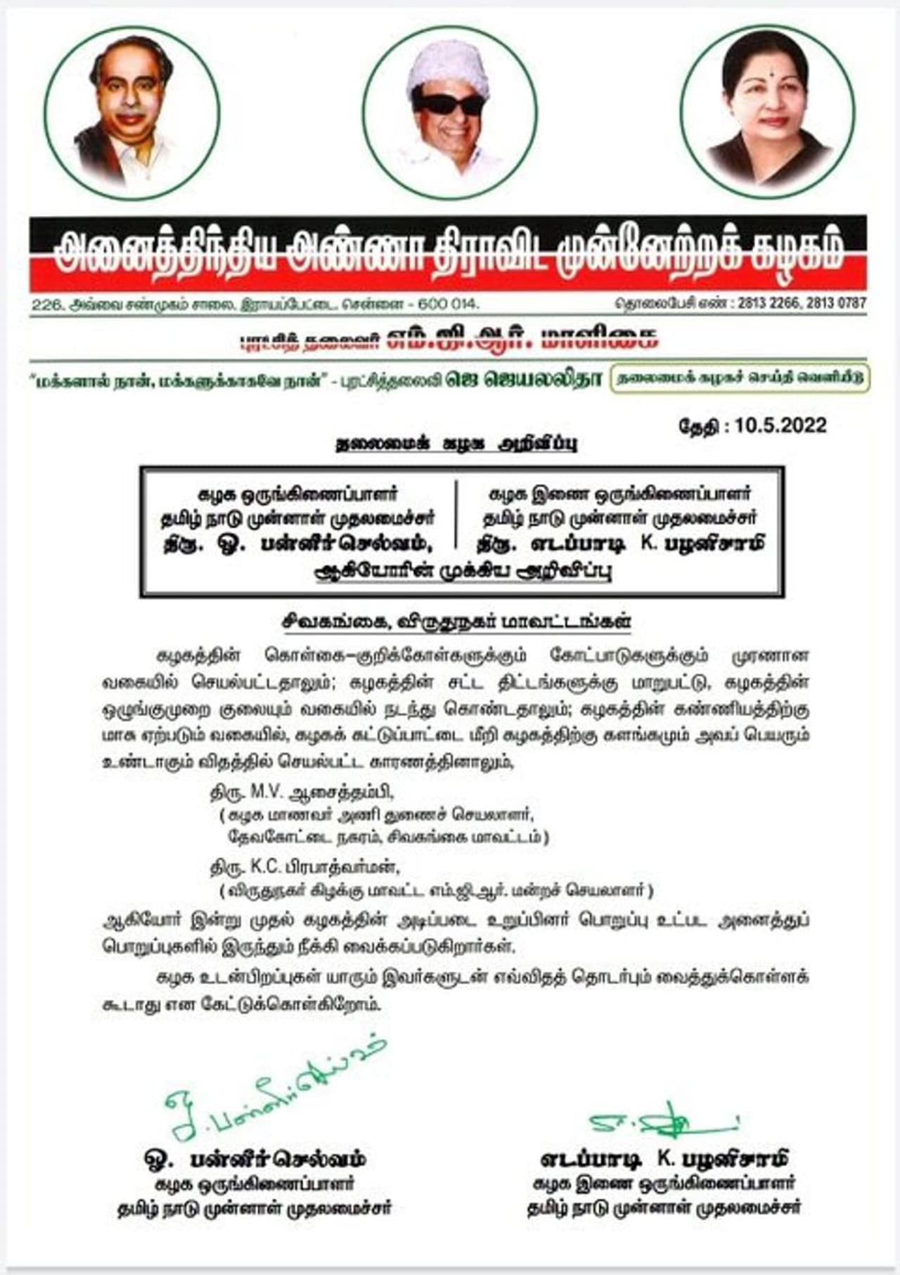 ஆகியோர் இன்று முதல் கழகத்தின் அடிப்படை உறுப்பினர் பொறுப்பு உட்பட அனைத்துப் பொறுப்புகளில் இருந்தும் நீக்கி வைக்கப்படுகிறார்கள். கழக உடன்பிறப்புகள் யாரும் இவர்களுடன் எவ்விதத் தொடர்பும் வைத்துக்கொள்ளக் கூடாது என கேட்டுக்கொள்கிறோம் என தெரிவித்துள்ளனர்.