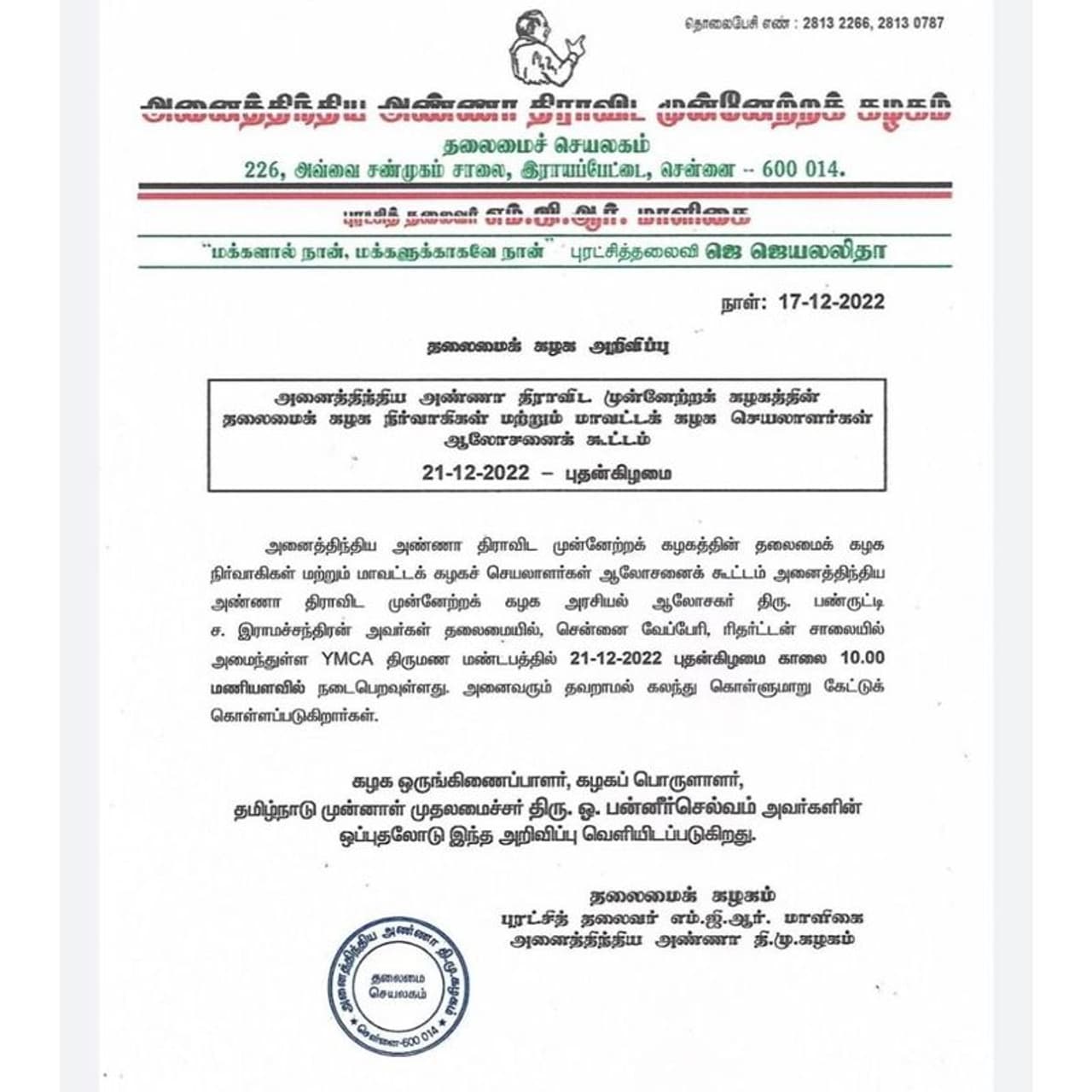பண்ருட்டி ராமச்சந்திரன் தலைமையில் மாவட்ட செயலாளர்கள் கூட்டம் நடைபெறும் என்று ஓ.பன்னீர்செல்வம் ஒப்புதலோடு தலைமைக் கழகம் பெயரில் அறிவிப்பு வெளியாகி இருக்கிறது. எடப்பாடி பழனிசாமி தலைமையிலான குழு கட்சி கூட்டம், போராட்டம் என்று ஆக்டிவாக இருப்பதால், ஓ.பன்னீர்செல்வமும் தன்னுடைய பங்குக்கு ஆட்டத்தை ஆரம்பித்துள்ளார் என்றும் கிசுகிசுக்கின்றனர்.