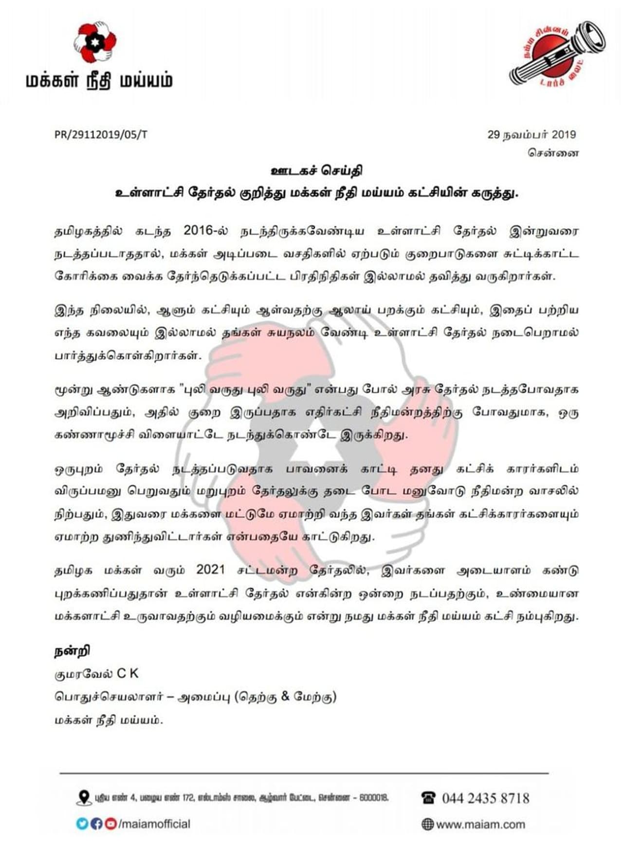 3 ஆண்டுகளாக "புலி வருது புலி வருது" என்பது போல் அரசு தேர்தல் நடத்தபோவதாக அறிவிப்பதும், அதில் குறை இருப்பதாக எதிர்கட்சி நீதிமன்றத்திற்கு போவதுமாக, ஒரு கண்ணாமூச்சு விளையாட்டே நடந்துக்கொண்டே இருக்கிறது என மக்கள் நீதி மய்யம் கடுமையாக விமர்சனம் செய்துள்ளது.