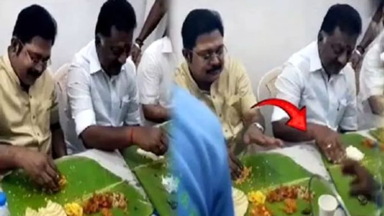 திருமணம் முடிந்த பிறகு ஜே.சி.டி., பிரபாகரன், ஓ.பன்னீர்செல்வம், டிடிவி தினகரன், கு.ப.கிருஷ்ணன், வெல்லமண்டி நடராஜன் ஆகியோர் விஐபி சாப்பிடும் இடத்துக்கு வர, அந்த இடமே பரபரப்பானது. ஒவ்வொரு வாழை இலையும் பெரிதாக வைக்கப்பட, டிடிவி தினகரன் பக்கத்தில் அமர்ந்து சாப்பிட்ட ஓ.பன்னீர்செல்வம் தனது வாழை இலையை பாதியாக மடக்கி விட, அதில் சாப்பாடு சாப்பிட்டார்.