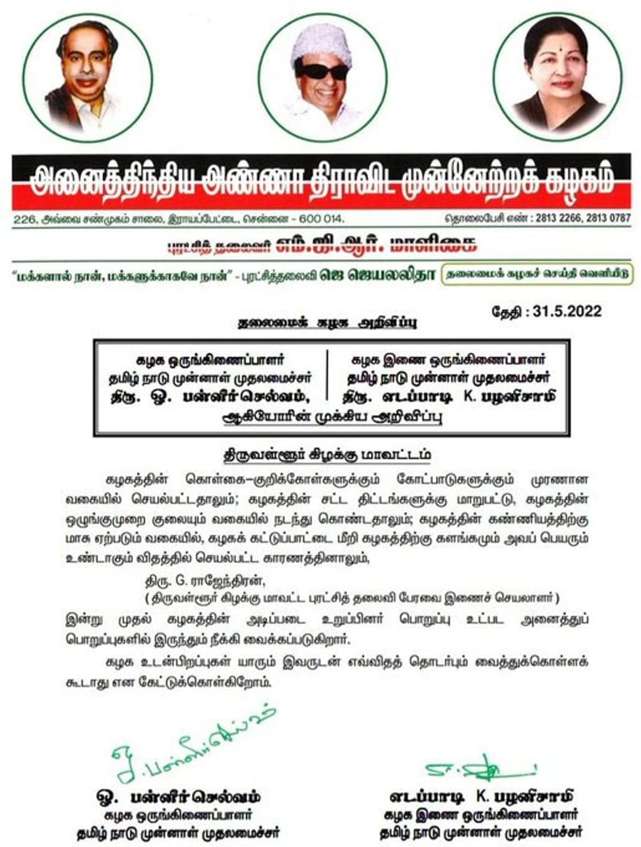 G. ராஜேந்திரன் (திருவள்ளூர் கிழக்கு மாவட்ட புரட்சித் தலைவி பேரவை இணைச் செயலாளர்) இன்று முதல் கழகத்தின் அடிப்படை உறுப்பினர் பொறுப்பு உட்பட அனைத்துப் பொறுப்புகளில் இருந்தும் நீக்கி வைக்கப்படுகிறார்.