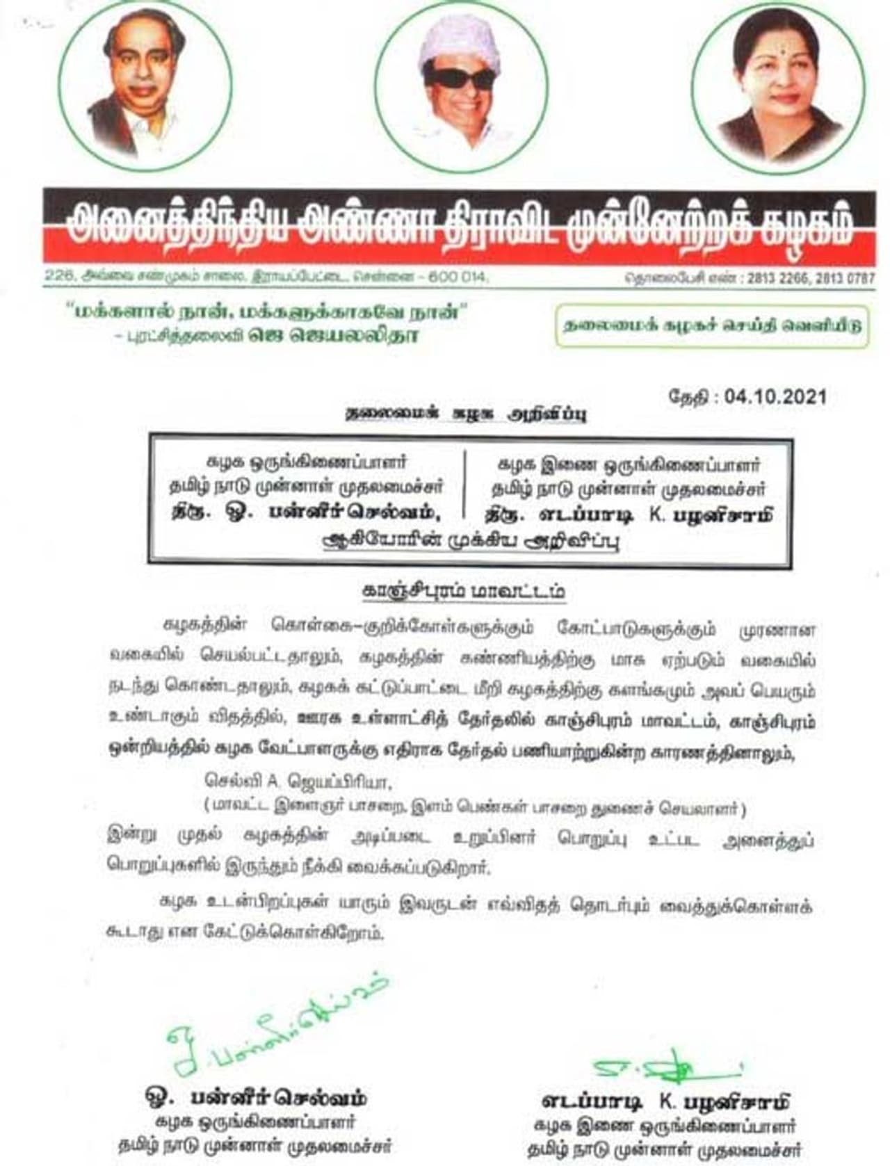 இதுதொடர்பாக அதிமுக ஒருங்கிணைப்பாளர் ஓ.பன்னீர்செல்வம், இணை ஒருங்கிணைப்பாளர் எடப்பாடி பழனிசாமி கூட்டாக வெளியிட்டுள்ள அறிக்கையில்;- கழகத்தின் கொள்ளை-குறிக்கோள்களுக்கும் கோட்பாடுகளுக்கும் முரணான வகையில் செயல்பட்டதாலும், கழகத்தின் கண்ணியத்திற்கு மாசு ஏற்படும் வகையில் நடந்து கொண்டதாலும், கழகக் கட்டுப்பாட்டை மீறி கழகத்திற்கு களங்கமும் அவப்பெயரும் உண்டாகும் விதத்தில் ஊரக உள்ளாட்சித் தேர்தலில் காஞ்சிபுரம் மாவட்டம் காஞ்சிபுரம் ஒன்றியத்தில் கழக வேட்பாளருக்கு எதிராக தேர்தல் பணியாற்றுகின்ற காரணத்தினாலும் ஜெயப்பிரியா ( மாவட்ட இளைஞர் பாசறை, இளம் பெண்கள் பாசறை துணைச் செயலாளர்)