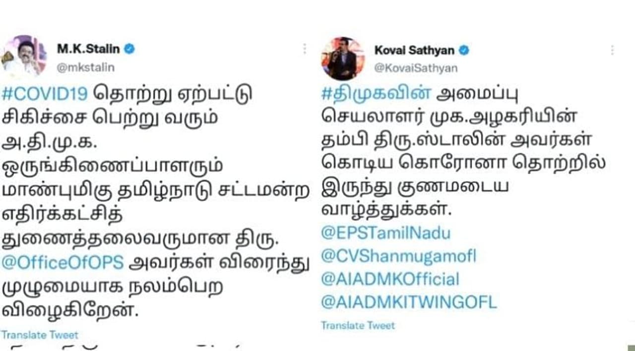 இந்தநிலையில் கொரோனா பாதிப்பு காரணமாக முதலமைச்சர் மு.க.ஸ்டாலின் மருத்துவமனையில் அனுமதிக்கப்பட்டிருந்தார். அவரது உடல்நிலை தேறி வர வேண்டும் என ஓ.பன்னீர் செல்வம் டுவிட்டர் பதிவிட்டிருந்தார். இதனையடுத்த ஒரு சில தினங்களில் ஓ.பன்னீர் செல்வமும் கொரோனா தொற்றால் பாதிக்கப்பட்டிருந்தார். இதனை அறிந்த முதலமைச்சர் மு.க.ஸ்டாலின் டுவிட்டர் பதிவொன்றை வெளியிட்டார். அதில் கொரோனா தொற்று ஏற்பட்டு சிகிச்சை பெற்று வரும் அ.தி.மு.க. ஒருங்கிணைப்பாளரும் மாண்புமிகு தமிழ்நாடு சட்டமன்ற எதிர்க்கட்சித் துணைத்தலைவருமான ஓ.பன்னீர் செல்வம் விரைந்து முழுமையாக நலம்பெற விழைகிறேன் என கூறியிருந்தார். இதற்க்கு இபிஎஸ் ஆதரவு நிர்வாகிகள் கடும் கண்டனத்தை தெரிவித்துள்ளனர். அதிமுக செய்தி தொடர்பாளரும், ஐடி விங் நிர்வாகியுமான கோவை சத்யன் வெளியிட்டுள்ள டுவிட்டர் பதிவில் திமுக அமைப்பு செயலாளர் மு.க. அழகிரியின் சகோதரர் மு.க.ஸ்டாலின் கொரோனா தொற்றில் இருந்து குணமடைய வாழ்த்துக்கள் என தெரிவித்துள்ளார். இதே போல அதிமுக வழக்கறிஞர் பாபு முருகவேல் கூறுகையில், முதலமைச்சர் மு.க.ஸ்டாலின் உள்நோக்கத்தோடு தான் கருத்தை பதிவிட்டுள்ளதாக குற்றம்சாட்டியுள்ளார்.