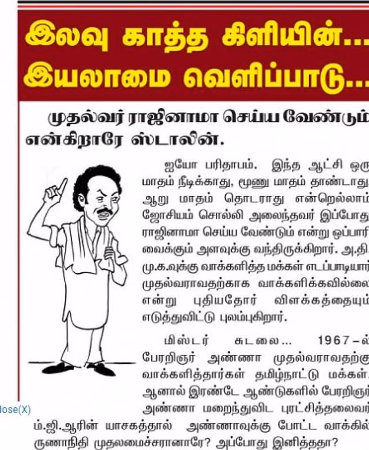 இலவுகாத்த கிளியின் இயலாமை வெளிப்பாடு என்கிற தலைப்பில் நமது அம்மா நாளிதழில் வெளியாகி உள்ள கட்டுரையில், ’’முதல்வர் ராஜினிஆம செய்ய வேண்டும் என்கிறாரே ஸ்டாலின். ஐயோ பரிதாபம். இந்த ஆட்சி ஒரு மாதம் நீடிக்காது, மூணு மாதம் தாண்டாது. ஆறு மாதம் தொடராது என்றெல்லாம் ஜோசியம் சொல்லி அலைந்தவர் இப்போது ராஜினாமா செய்ய வேண்டும் என்று ஒப்பாரி வைக்கும் அளவுக்கு வந்திருக்கிறார். அதிமுகவுக்கு வாக்களித்த மக்கள் எடப்பாடியார் முதல்வராவதற்காக வாக்களிக்கவில்லை என்று புதியதோர் விளக்கத்தையும் எடுத்து விட்டு புலம்புகிறார்.