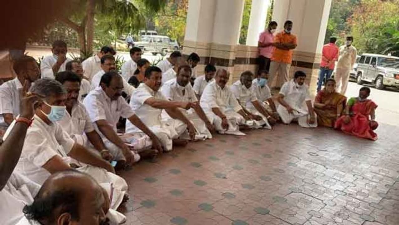 வெளியூர் சேர்ந்தவர்களை வெளியேற்றவேண்டும் என வலியுறுத்தி அதிமுக முன்னாள் அமைச்சரும் , எம்எல்ஏவுமான எஸ்.பி வேலுமணி உட்பட 9 எம் எல்ஏக்கள் மற்றும் கட்சி நிர்வாகிகள் கலெக்டர் அலுவலகத்தில் தர்ணா போராட்டத்தில் ஈடுபட்டனர். தரையில் அமர்ந்து கோஷமிட்டு கடும் எதிர்ப்பு காட்டினர் போராட் டத்தை கைவிட மறுத்து அவர்கள் ஆவேசமாக பேசினர்.