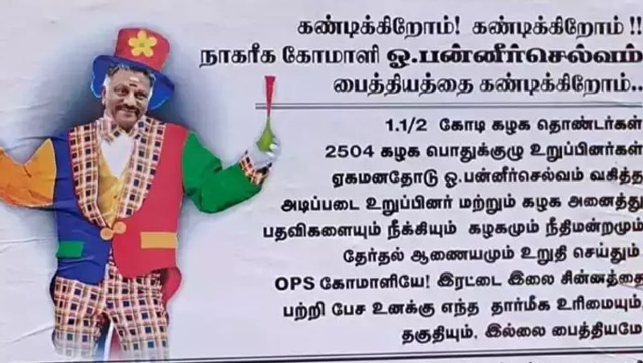 நாகரீக கோமாளி ஓ.பன்னீர்செல்வம் பைத்தியத்தை கண்டிக்கிறோம் என்று அதிமுகவினர் ஓட்டிய போஸ்டர்களால் பெரும் பரபரப்பு ஏற்பட்டுள்ளது.