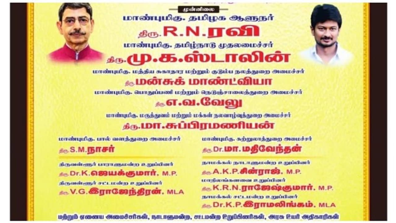 மருத்துவ கல்லூரி திறப்பு விழா அழைப்பிதழில் பிரதமர் மோடி, மு.க.ஸ்டாலின், ஆளுநர் ரவி இவர்களுடன் உதயநிதி ஸ்டாலின் ஆகியோரில் புகைப்படங்கள் மட்டுமே அச்சிடப்பட்டுள்ளது.