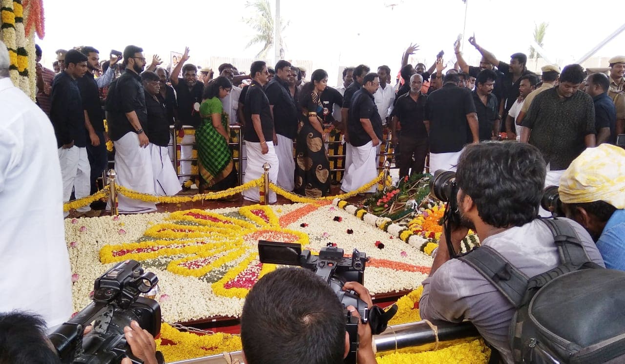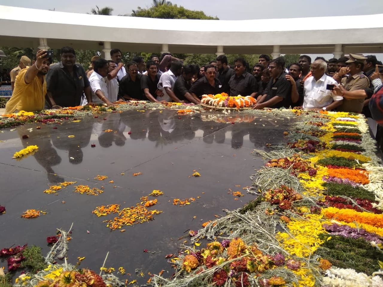 அழகிரி இன்று தனது ஆதரவாளர்களுடன் அமைதி பேரணி சென்று கலைஞர் நினைவகத்தில் அஞ்சலி செலுத்தினார். முழுக்க முழுக்க மதுரை மல்லியால் அலங்கரிக்கப்பட்ட கலைஞர் நினைவகத்தில் மல்லிகை வாசம் தூக்குகிறது.