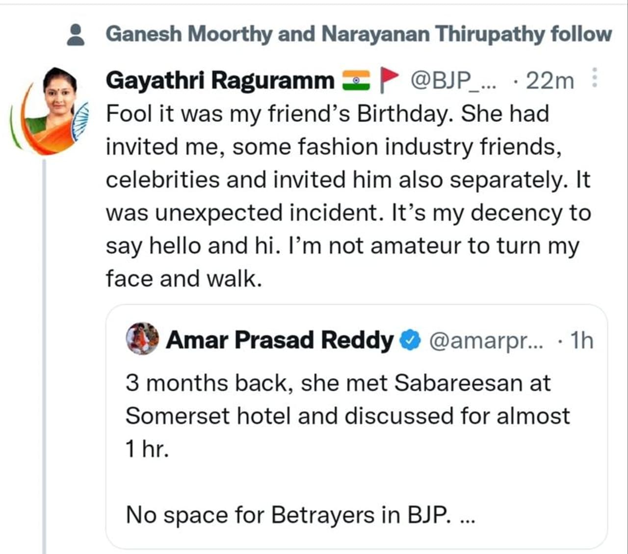 இந்த பதிவிற்கு பதிலடி கொடுக்கும் வகையில் அந்த பதிவை டேக் செய்து காய்த்ரி ரகுராம் பதிவு ஒன்று வெளியிட்டுள்ளார். அதில், இது முட்டாள் தனமான கருத்து, தனது தோழியின் பிறந்தநாளுக்கு சென்றிருந்தேன். அப்போது என்னை அழைத்தது போல் பல்வேறு துறைகளில் சிறந்து விளங்குபவர்களையும் அழைக்கப்பட்டிருந்தனர். அப்போது அவரையும் அழைத்துள்ளனர். இது ஒரு எதிர்பாராத சந்திப்பு. வணக்கம் சொல்லும் போது திருப்பி வணக்கம் சொன்னதாக கூறியுள்ளார். முகத்தை திருப்பி கொண்டு நடக்க நான் ஒன்றும் சிறு பிள்ளை இல்லையென கூறியுள்ளார். இதனிடையே தான் பதிவிட்ட டுவிட்டர் பதிவை காய்த்ரி ரகுராம் நீக்கியுள்ளார்.
