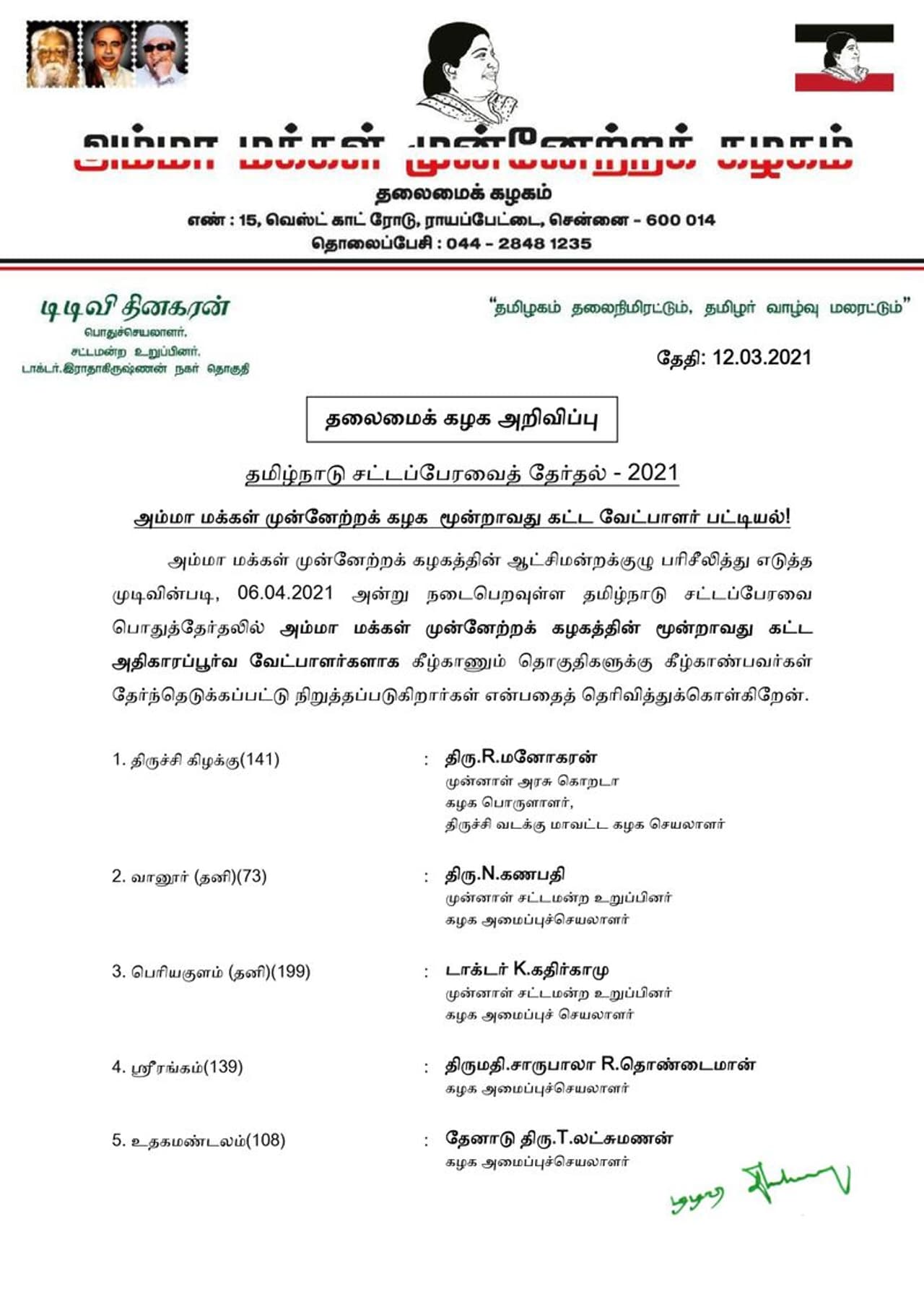 இன்று டி.டி.வி. தினகரன் 130 வேட்பாளர்களின் பெயர்கள் அடங்கிய மூன்றாம் கட்ட பட்டியலை வெளியிட்டுள்ளார்.