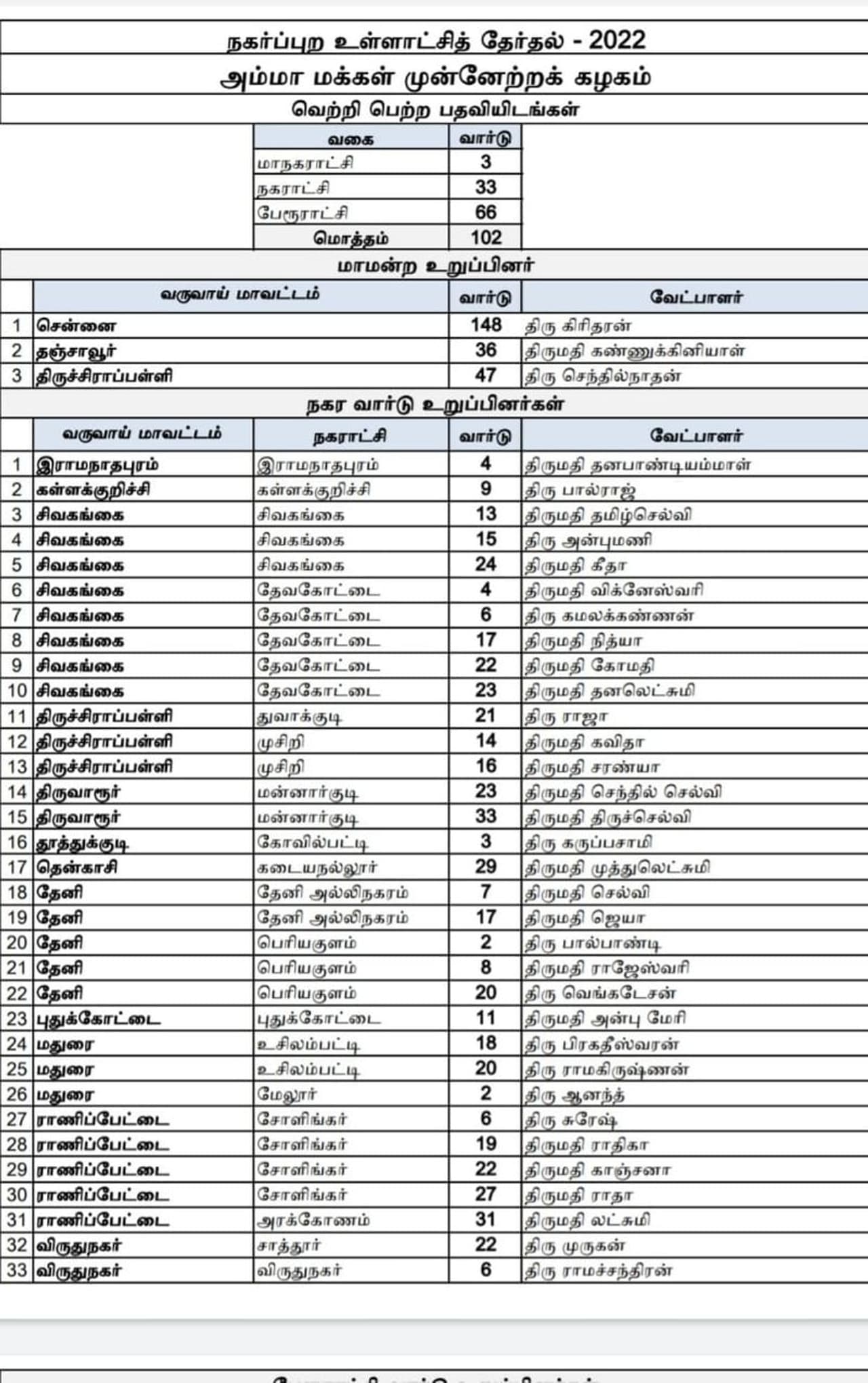 இந்நிலையில், தமிழ்நாட்டில் உள்ள 21 மாநகராட்சிகள், 138 நகராட்சிகள் மற்றும் 490 பேரூராட்சிகள் ஆகியவற்றுக்கு கடந்த 19ம் தேதி ஒரே கட்டமாக தேர்தல் நடைபெற்றது. இதில், பதிவான வாக்குகள் நேற்று எண்ணப்பட்டன. இதில், மாநகராட்சிகளில் 3 பேர் வெற்றி பெற்றுள்ளனர். சென்னை 146 வார்டிலும், தஞ்சாவூர் மாநகராட்சி 36 வது வார்டிலும், திருச்சி மாநகராட்சி 47வது வார்டிலும் அமமுக வெற்றி பெற்றுள்ளது.
