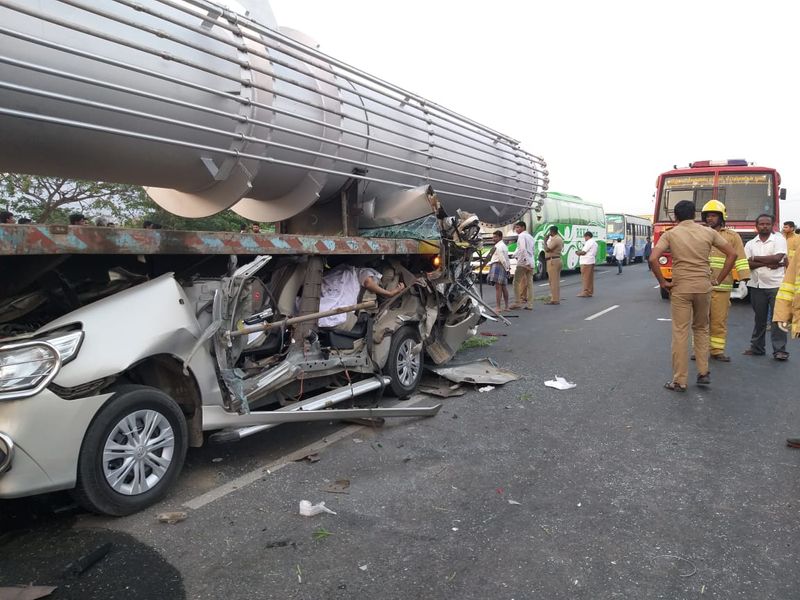 இன்று காலை விண்ணமங்கலம் தேசிய நெடுஞ்சாலையில் சென்றபோது கண்டெய்னர் லாரி மீது கார் மோதி விபத்துக்குள்ளானது. இதில் கார் முற்றிலும் நொறுங்கி, லாரியின் அடியில் சிக்கிக்கொண்டது.