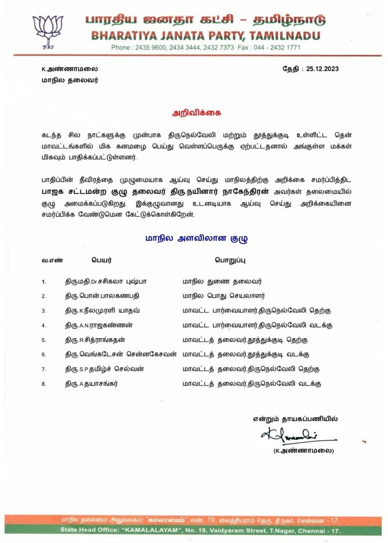 பாதிப்பின் தீவிரத்தை முழுமையாக ஆய்வு செய்து மாநிலத்திற்கு அறிக்கை சமர்ப்பித்திட பாஜக சட்டமன்ற குழு தலைவர் திரு.நயினார் நாகேந்திரன் அவர்கள் தலைமையில் குழு அமைக்கப்படுகிறது. இக்குழுவானது உடனடியாக ஆய்வு செய்து அறிக்கையினை சமர்ப்பிக்க வேண்டுமென கேட்டுக்கொள்கிறேன். 1. Dr.சசிகலா புஷ்பா, மாநில துணை தலைவர், 2. பொன்.பாலகணபதி , மாநில பொது செயலாளர், 3. K.நீலமுரளி யாதவ் மாவட்ட பார்வையாளர், திருநெல்வேலி தெற்கு, 4. A.N.ராஜகண்ணன் மாவட்ட பார்வையாளர்,திருநெல்வேலி வடக்கு