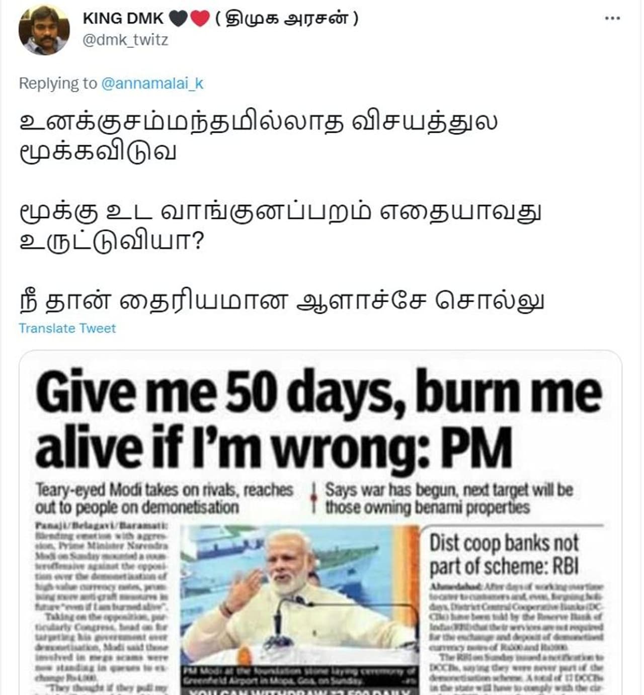 அதே நேரத்தில் உடன்பிறப்புகளும் பதிலடியால் அண்ணாமலையையும், பாஜகவையும் கலாய்த்து தள்ளி வருகின்றனர். நாட்டை சீரமைக்க 50 நாட்கள் எனக்கு கொடுங்கள்.. முடியாவிட்டால் கொளுத்துங்கள் என்று பிரதமர் மோடி கூறியதை எடுத்து போட்டு, இது எப்படி இருக்கு என்று பட்டாசு கிளப்பி இருக்கின்றனர்.