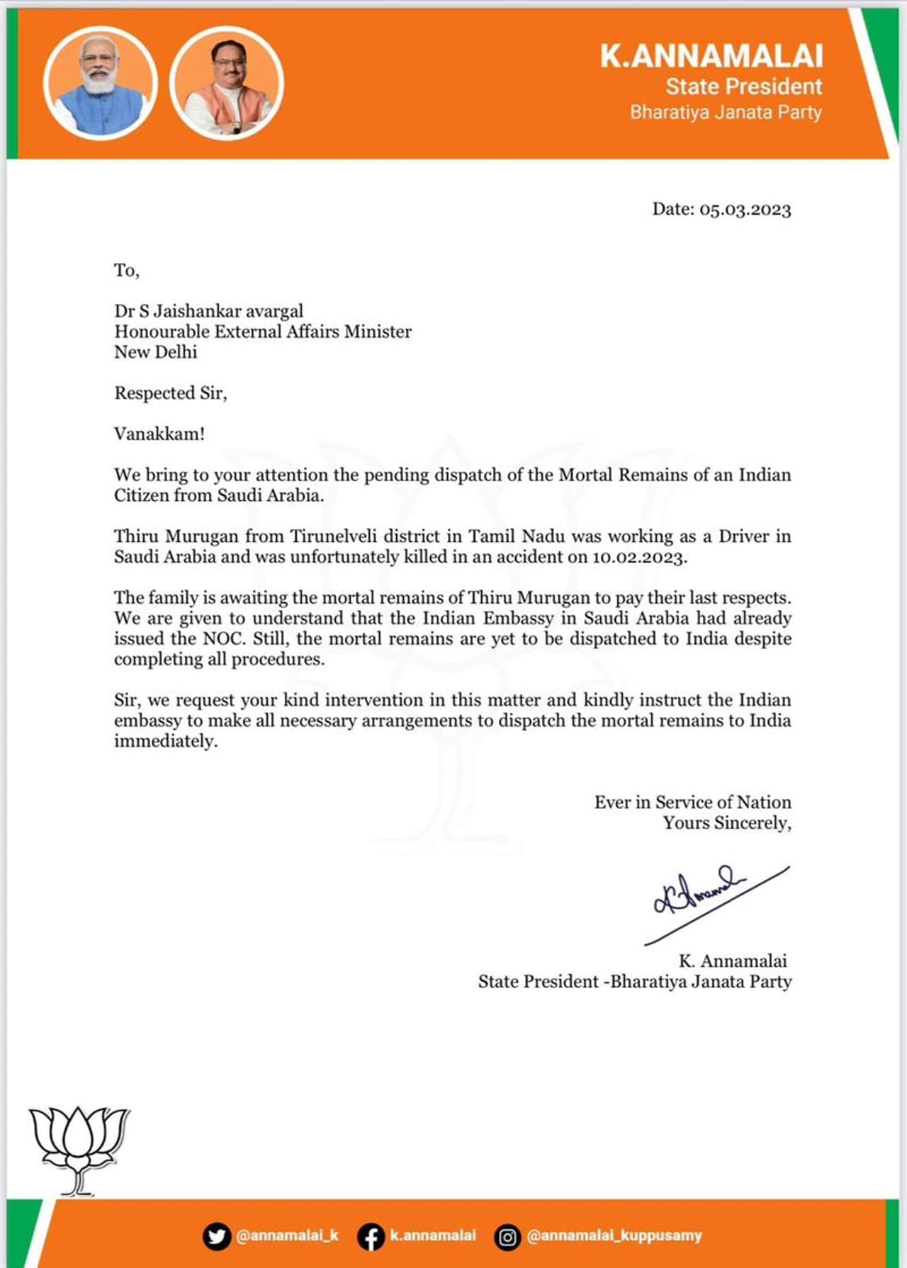 சவுதி அரேபியாவில் பணியாற்றி வந்த தமிழக தொழிலாளி விபத்தில் உயிரிழந்ததை அவரின் உடலை தமிழகம் கொண்டு வர வெளியுறவுத்துறை அமைச்சர் ஜெய்சங்கரிடம் தமிழக பாஜக தலைவர் அண்ணாமலை உதவிகோரியுள்ளார். இதுக்குறித்து வெளியுறவுத்துறை அமைச்சர் ஜெய்சங்கருக்கு தமிழக பாஜக தலைவர் அண்ணாமலை அனுப்பிய கடிதத்தில், தமிழ்நாட்டின் திருநெல்வேலி மாவட்டத்தைச் சேர்ந்த திருமுருகன் என்பவர் சவூதி அரேபியாவில் ஓட்டுநராகப் பணிபுரிந்து வந்த நிலையில் 10.02.2023 அன்று விபத்தில் உயிரிழந்தார். திருமுருகனின் உடலுக்கு இறுதி அஞ்சலி செலுத்த குடும்பத்தினர் காத்திருக்கின்றனர்.