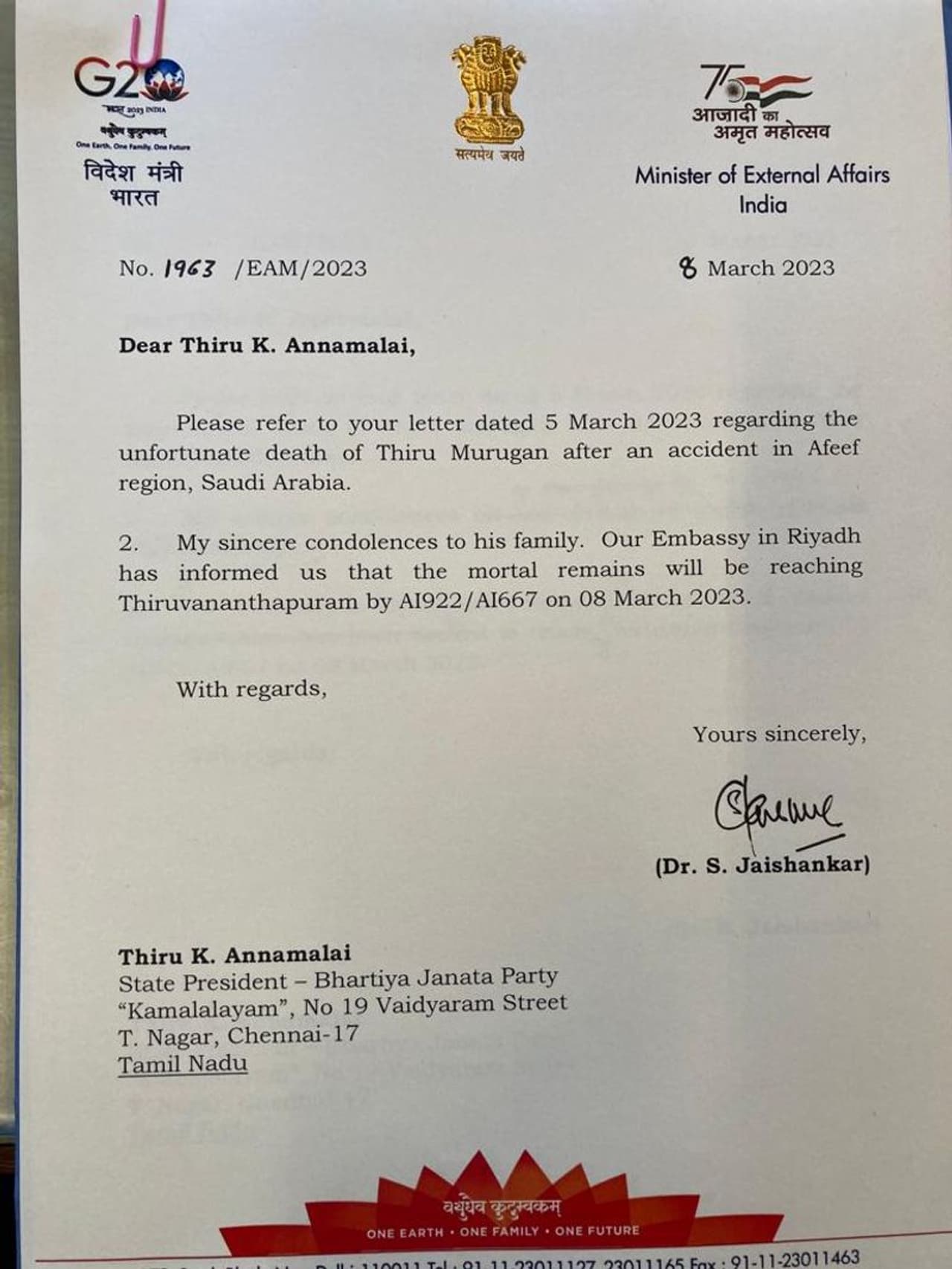 இதற்கு பதிலளித்துள்ள வெளியுறவுத்துறை அமைச்சகம், சவூதி அரேபியாவின் அஃபீஃப் பகுதியில் விபத்தில் திரு முருகன் துரதிர்ஷ்டவசமாக இறந்தது தொடர்பாக மார்ச் 5, 2023 தேதி அனுப்பிய கடிதத்தை பார்த்தேன். உயிரிழந்தவரின் குடும்பத்தினருக்கு எனது ஆழ்ந்த அனுதாபங்கள். ரியாத்தில் உள்ள இந்திய தூதரகம் 08 மார்ச் 2023 அன்று உடல் AI922/AI667 மூலம் திருவனந்தபுரத்தை அடையும் என்று தெரிவித்துள்ளதாக பதில் கடிதத்தில் குறிப்பிட்டுள்ளது.