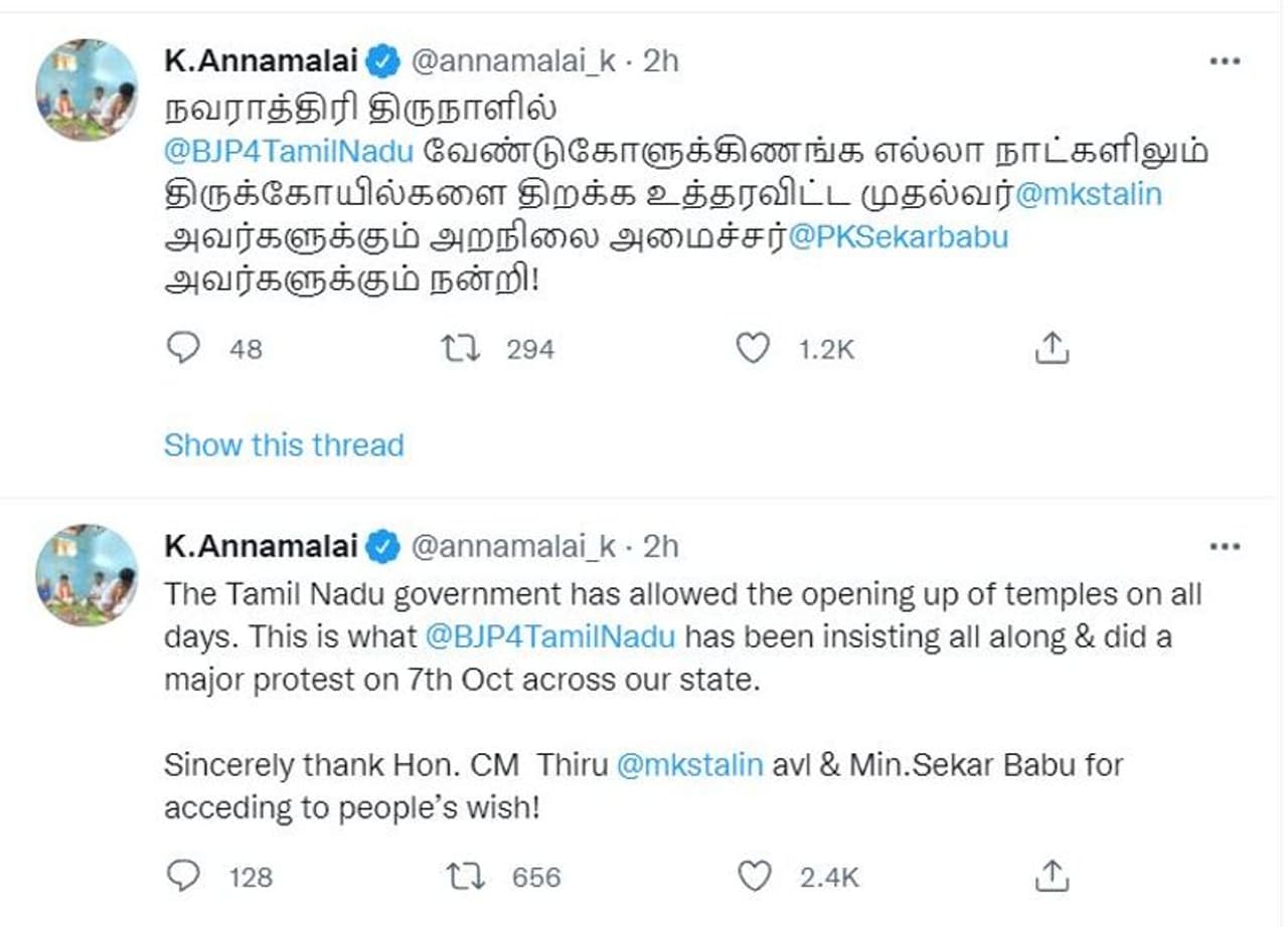நவராத்திரி தினத்தில் தமிழக பாஜக வேண்டுகோளை ஏற்று அனைத்து நாட்களிலும் கோயில்களை திறக்க உத்தரவிட்ட முதலமைச்சர் ஸ்டாலின் மற்றும் அமைச்சர் சேகர்பாபுக்கு நன்றி என்று கூறி உள்ளார்.