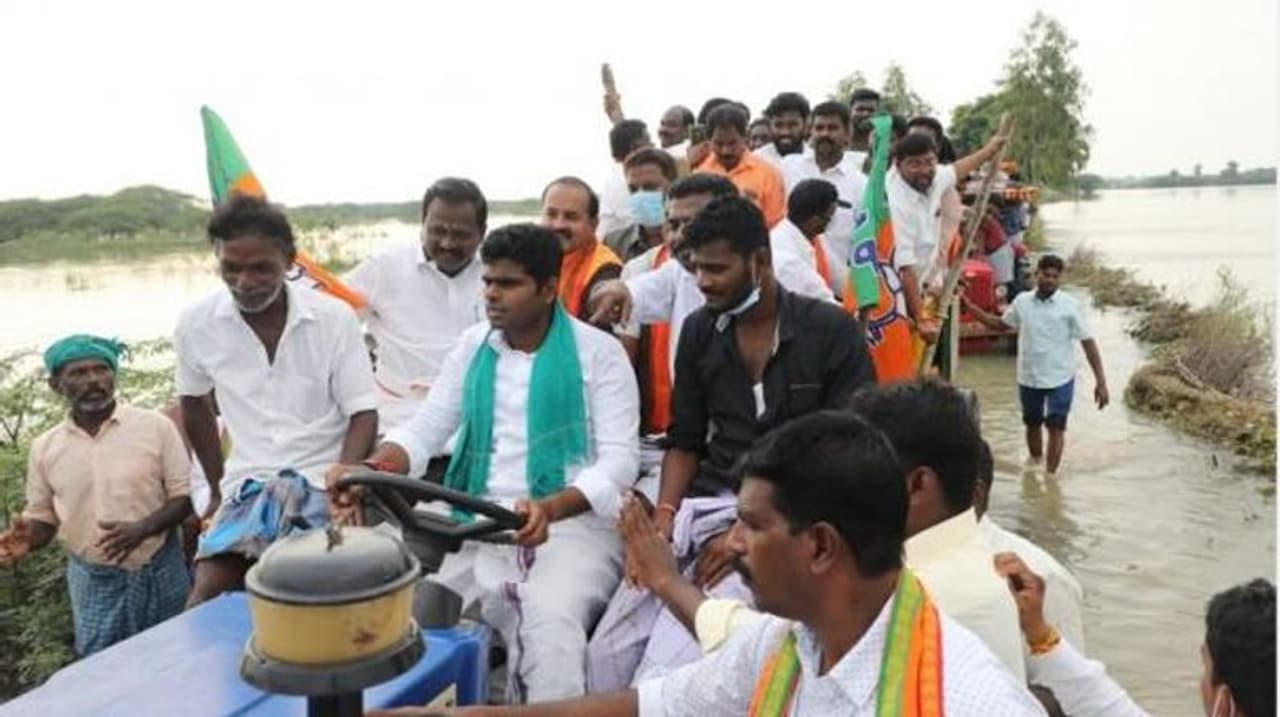 அங்கு பாதிக்கப்பட்ட பயிர்களை தமிழக பாஜக தலைவர் அண்ணாமலை பார்வையிட்டார். காரில் வந்து இறங்கிய அண்ணாமலை.. பின்னர் டிராக்டரில் ஏறினார். கிட்டத்தட்ட ஒரு கிலோ மீட்டர் தூரம் டிராக்டரில் பயணம் செய்து வெள்ள நிலைமைகளை நேரில் கேட்டறிந்தார்.
