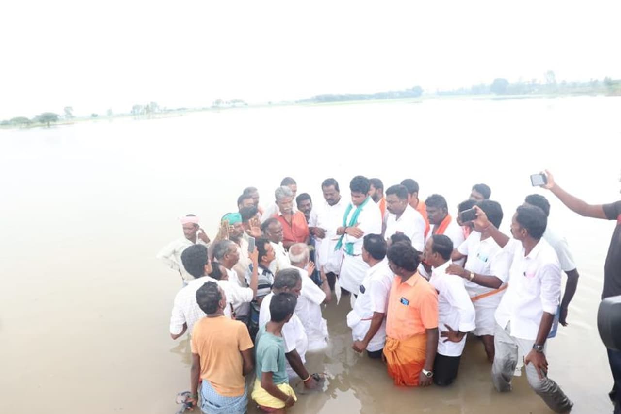 தண்ணீர் தேங்கிய விளைநிலங்களில் கால் வைத்த அண்ணாமல, பாதிப்பு விவரங்கள் பற்றி விவசாயிகளிடம் விவரங்களை கேட்டுக் கொண்டார். ஏன் இங்கு இவ்வளவு வெள்ளம்? எத்தனை ஆண்டுகளாக இத்தகைய பாதிப்புகளை சந்தித்து வருகிறீர்கள் உள்ளிட்ட விவரங்களை அவர் கேட்டார்.
