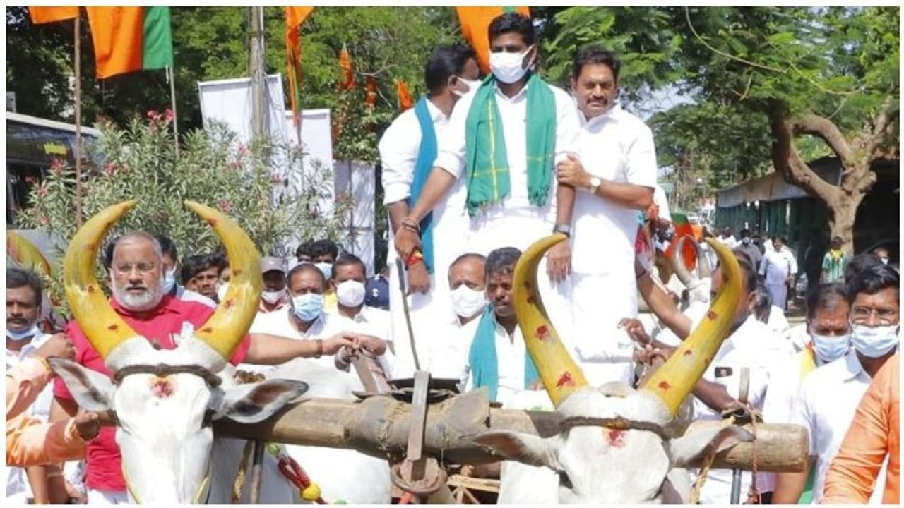கர்நாடகாவை கண்டித்து தஞ்சாவூரில் நடைபெறும் உண்ணாவிரததிற்கு பாஜக மாநில தலைவர் அண்ணாமலை மாட்டு வண்டியில் வந்தார்.