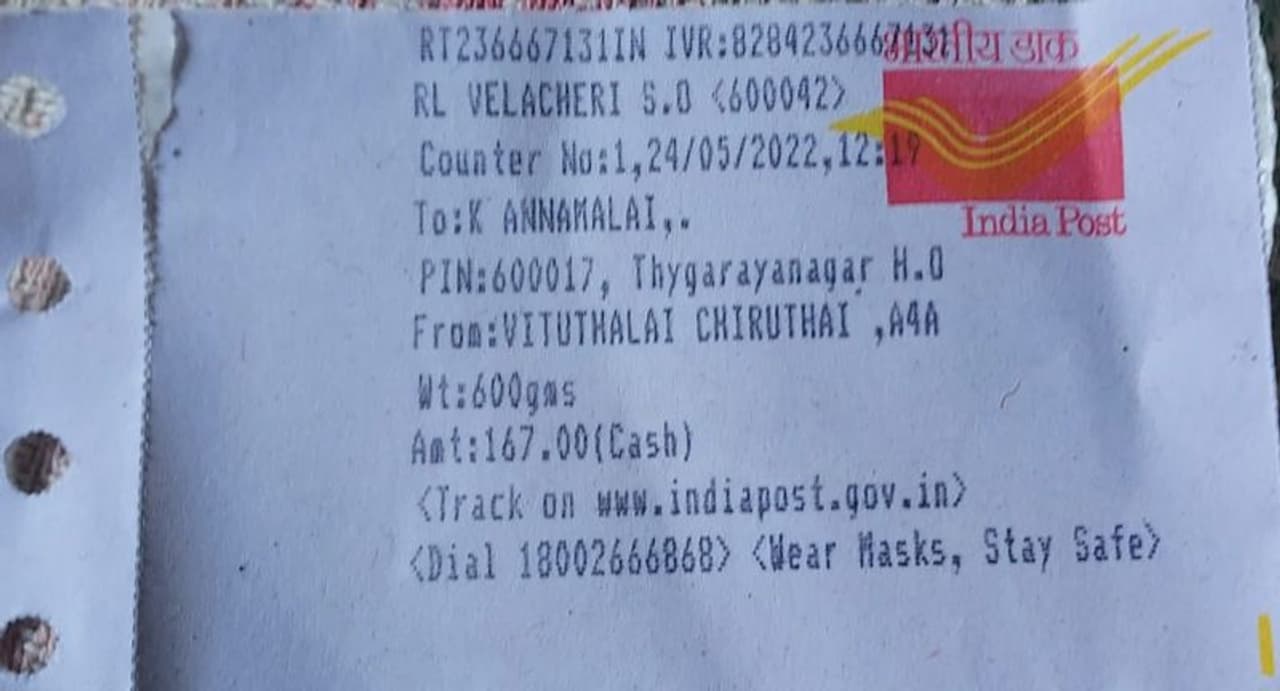 உங்கள் தலைவரின் ஒப்புதலோடு முற்போக்கு மாணவர் கழகம் சார்பில் புரட்சியாளர் அம்பேத்கர் அவர்கள் எழுதிய இந்து மதத்தின் புதிர்கள் reddles in Hinduism என்ற புத்தகத்தை உங்களுக்கு அஞ்சலில் அனுப்பி வைக்கிறோம். இந்தப் புத்தகம் யாரோ மூன்றாம் நபர் எழுதிய புத்தகம் அல்ல, புரட்சியாளர் அம்பேத்கர் அவர்கள் எழுதிய புத்தகம். இதை தாங்கள் அவசியம் படிப்பீர்கள் என்று நம்புகிறோம், இது குறித்து என்னுடன் விவாதிக்க விரும்பினால் எங்கள் மாணவர் அமைப்பினர் விவாதிக்க தயாராக இருக்கிறோம். என்பதை இதன் வழியே தெரிவித்துக் கொள்கிறோம். இவ்வாறு அதில் கூறப்பட்டுள்ளது. மேலும் அண்ணாமலைக்கு அம்பேத்கரின் எழுதிய புத்தகம் அனுப்பி வைக்கப்பட்டுள்ள விவரங்களும் அதில் இணைக்கப்பட்டுள்ளது.