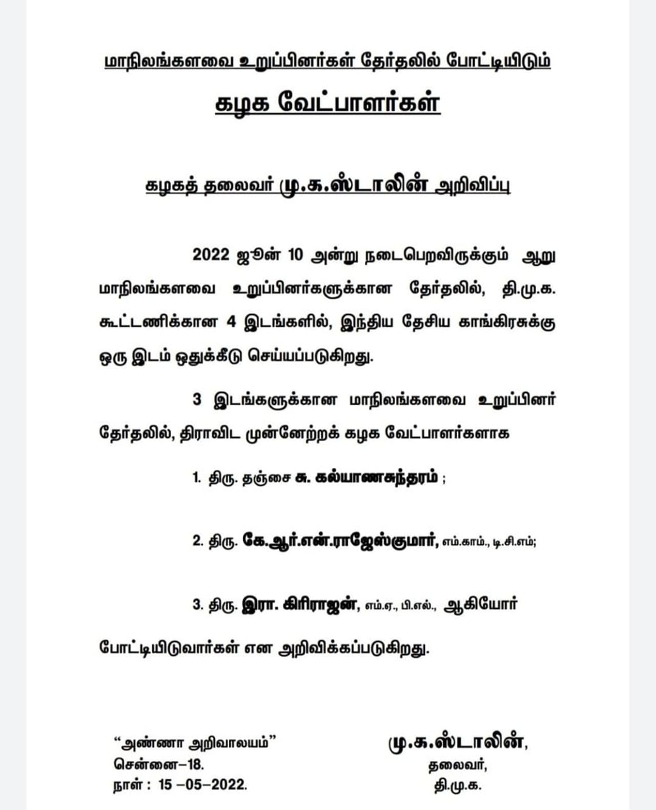 2022 ஜூன் 10 அன்று நடைபெறவிருக்கும் ஆறு மாநிலங்களவை உறுப்பினர்களுக்கான தேர்தலில், தி.மு.க. கூட்டணிக்கான 4 இடங்களில், இந்திய தேசிய காங்கிரசுக்கு ஒரு இடம் ஒதுக்கீடு செய்யப்படுகிறது.