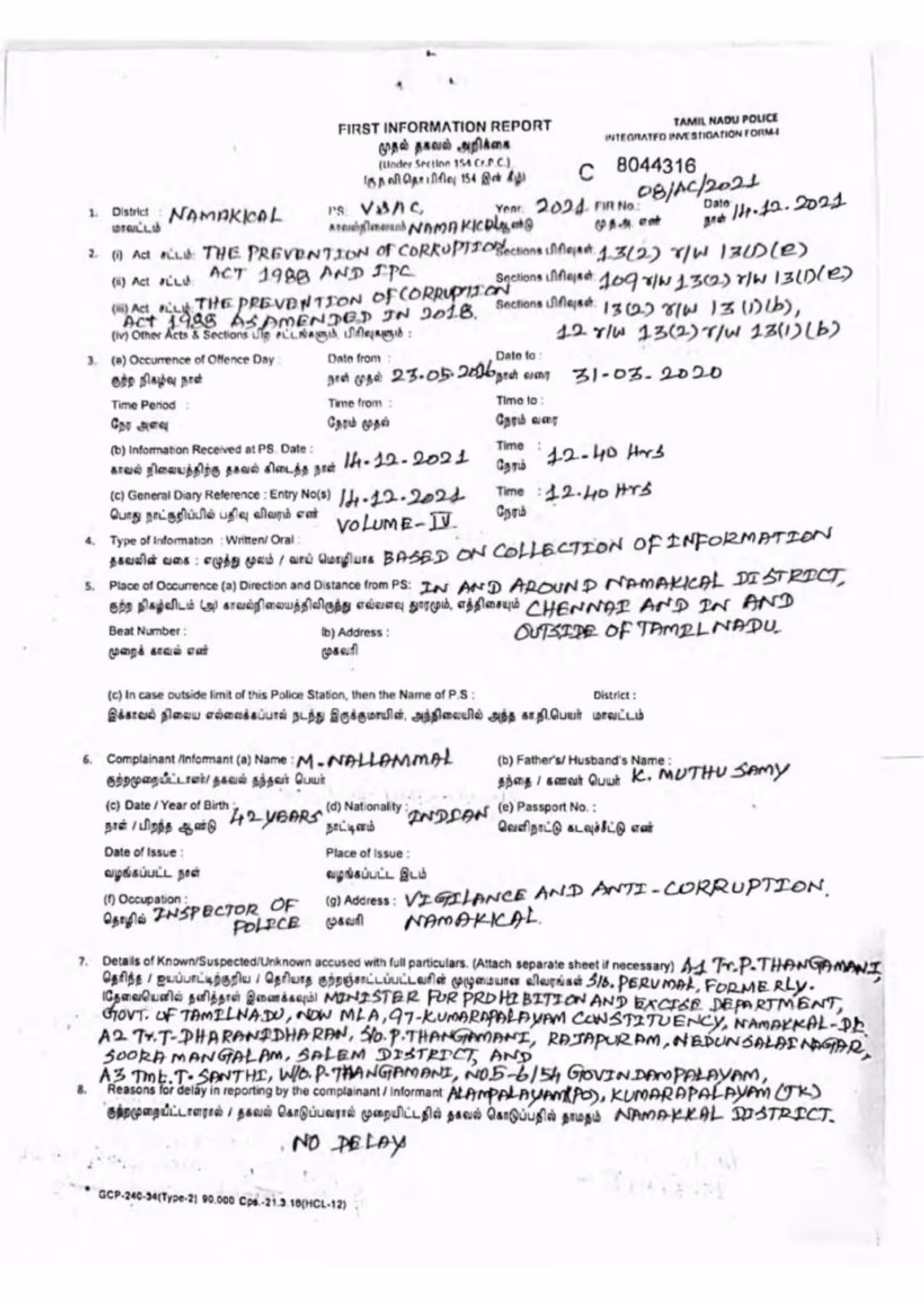 தமிழ்நாடு மின்சாரத் துறை முன்னாள் அமைச்சர் பி,தங்கமணி, தனது பெயரிலும், குடும்ப உறுப்பினர்கள் பெயரிலும் மற்றும் நெருங்கிய உறவினர்கள் மூலமும், 2016 முதல் 2020 வரையிலானபணிக்காலத்தில் வருமானத்திற்கு அதிகமாக சொத்துக்கள் சேர்த்துள்ளது சம்மந்தமாக நேற்று நாமக்கல் ஊழல் தடுப்பு மற்றும் சுண்காணிப்பு பிரிவில் வழக்கு பதிவு செய்யப்பட்டது.