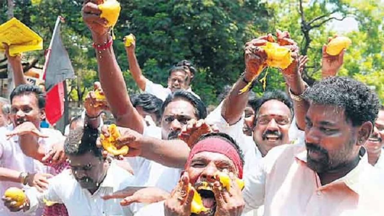 தமிழகத்தில் நடைபெற்ற தேர்தலில் திமுக கூட்டணி அமோக வெற்றி பெற்றதையடுத்து அறிவாலயத்தில் அக்கட்சித் தொண்டர்கள் கொண்டாடடத்தில் ஈடுபட்டனர். அப்போது தொண்டர்கள் சிலர் மாம்பழங்களை வாங்கி வந்து அதை நசுக்கி தூக்கி எறிந்து மகிழ்ச்சி அடைந்தனர்.