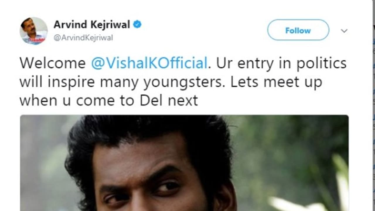 Arvind Kejriwal the Delhi Chief Minister and the Aam Aadmi Partys coordinator has been welcomed by actor Vishal for the RK Nagar election.