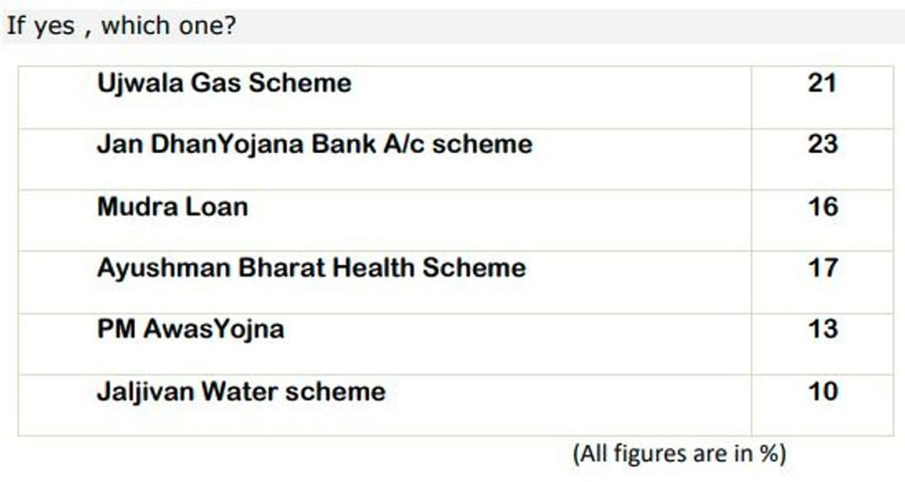 பிரதமர் மோடியின் திட்டங்கள் குறித்த விழிப்புணர்வு மக்களிடத்தில் இருக்கிறதா என்பதை அறிந்துகொள்ளும் விதமாக கேட்கப்பட்ட கேள்விக்கு, உஜ்வாலா கேஸ் திட்டம் பற்றி தெரியும் என்று 21% பேரும், ஜன் தன் வங்கிக்கணக்கு திட்டம் பற்றி 23% பேரும், முத்ரா லோன் குறித்து 16% பேரும் தெரியும் என்று கருத்து தெரிவித்தனர்.