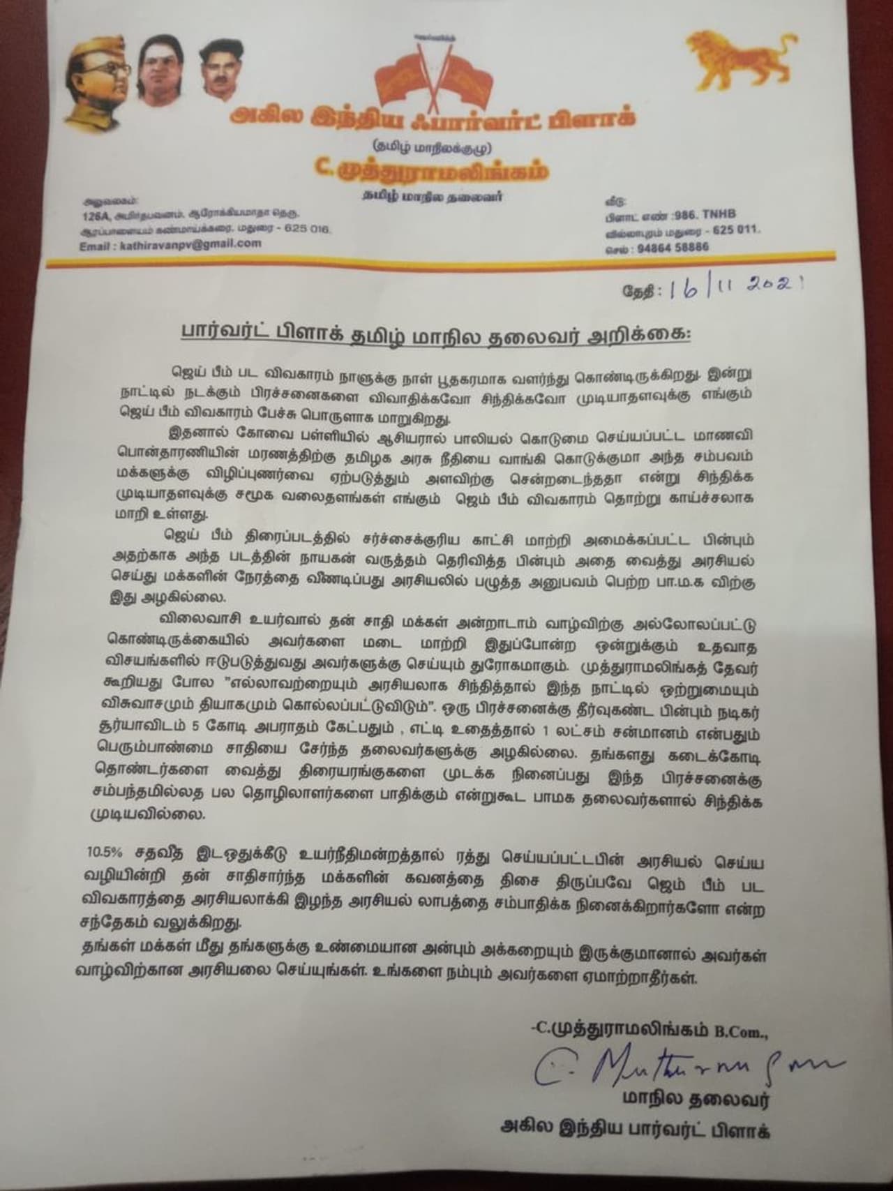 ஜெய் பீம் திரைப்படத்தில் சர்ச்சைக்குரிய காட்சி மாற்றி அமைக்கப்பட்ட பின்பும் அதற்காக அந்த படத்தின் நாயகன் வருத்தம் தெரிவித்த பின்பும் அதை வைத்து அரசியல் செய்து மக்களின் நேரத்தை வீணடிப்பது அரசியலில் பழுத்த அனுபவம் பெற்ற பா.ம.க விற்கு இது அழகில்லை என அகில் இந்திய பார்வர்ட் பிளாக் மாநிலத்தலைவர் முத்துராமலிங்கம் அறிக்கை வெளியிட்டுள்ளார். மேலும் அதில் கூறியிருப்பதாவது,