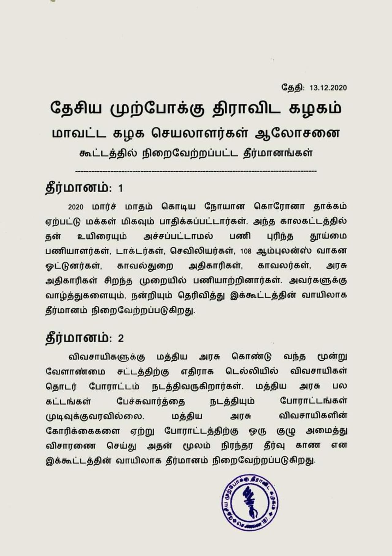 பின்னர், தேமுதிக சார்பில் 9 தீர்மானங்கள் நிறைவேற்றப்பட்டன. அதில், விவசாயிகள் பிரச்சனையில் தீர்வுகாண மத்திய அரசு குழு அமைக்க வேண்டும், டாஸ்மாக் கடைகளை உடனே மூட வேண்டும். பெட்ரோல், டீசல் விலையேற்றத்தை உடனே குறைக்க வேண்டுமென மத்திய அரசை தேமுதிக வலியுறுத்துகிறது. ஆஸ்திரேலிய அணிக்கு எதிரான தொடரில் சிறப்பாக பந்து வீசிய தமிழக வீரர் நடராஜனுக்கு பாராட்டு உள்ளிட்ட தீர்மானங்கள் நிறைவேற்றப்பட்டன.