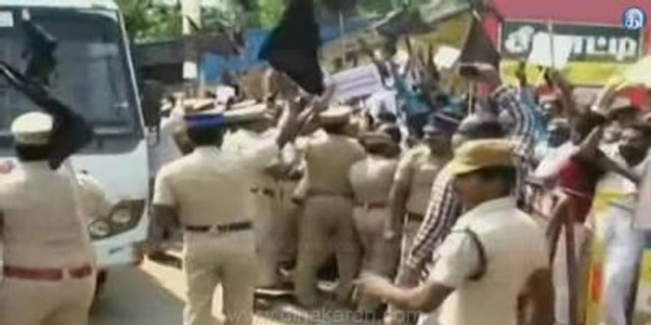 என்றாலும் ஆளுநர் வந்தபோது அவருடைய வாகனம் மீது கொடி கம்புகள் வீசப்பட்டன. மேலும் கற்கள் வீசப்பட்டதாகவும் புகார்கள் எழுந்தன. ஆனால், ஆளுநர் அணிவகுப்பில் கொடி கம்புகள், கற்கள் எதுவும் வீசப்படவில்லை என்று தமிழக போலீஸார் விளக்கம் அளித்துள்ளனர். மேலும் ஆளுநருக்கு எதிராக நடைபெற்ற இந்தப் போராட்டத்தில் சுமார் 150க்கும் மேற்பட்டோரை போலீசார் கைது செய்துள்ளனர். ஆளுநர் வானகத்தின் மீது கொடி கம்பு வீசி நடந்த இந்தப் போராட்டத்துக்கு அதிமுக, பாஜக ஆகிய கட்சிகள் கடும் கண்டனம் தெரிவித்துள்ளன. ஆளுநர் வாகனத்தில் கற்கள் வீசப்பட்டதாக கண்டனம் தெரிவித்த தமிழக பாஜக தலைவர் அண்ணாமலை, ‘இதற்கு பொறுப்பேற்று தமிழக முதல்வர் மு.க. ஸ்டாலின் பதவி விலக வேண்டும் அல்லது மன்னிப்பு கோர வேண்டும்” என்று கருத்து தெரிவித்திருந்தார்.