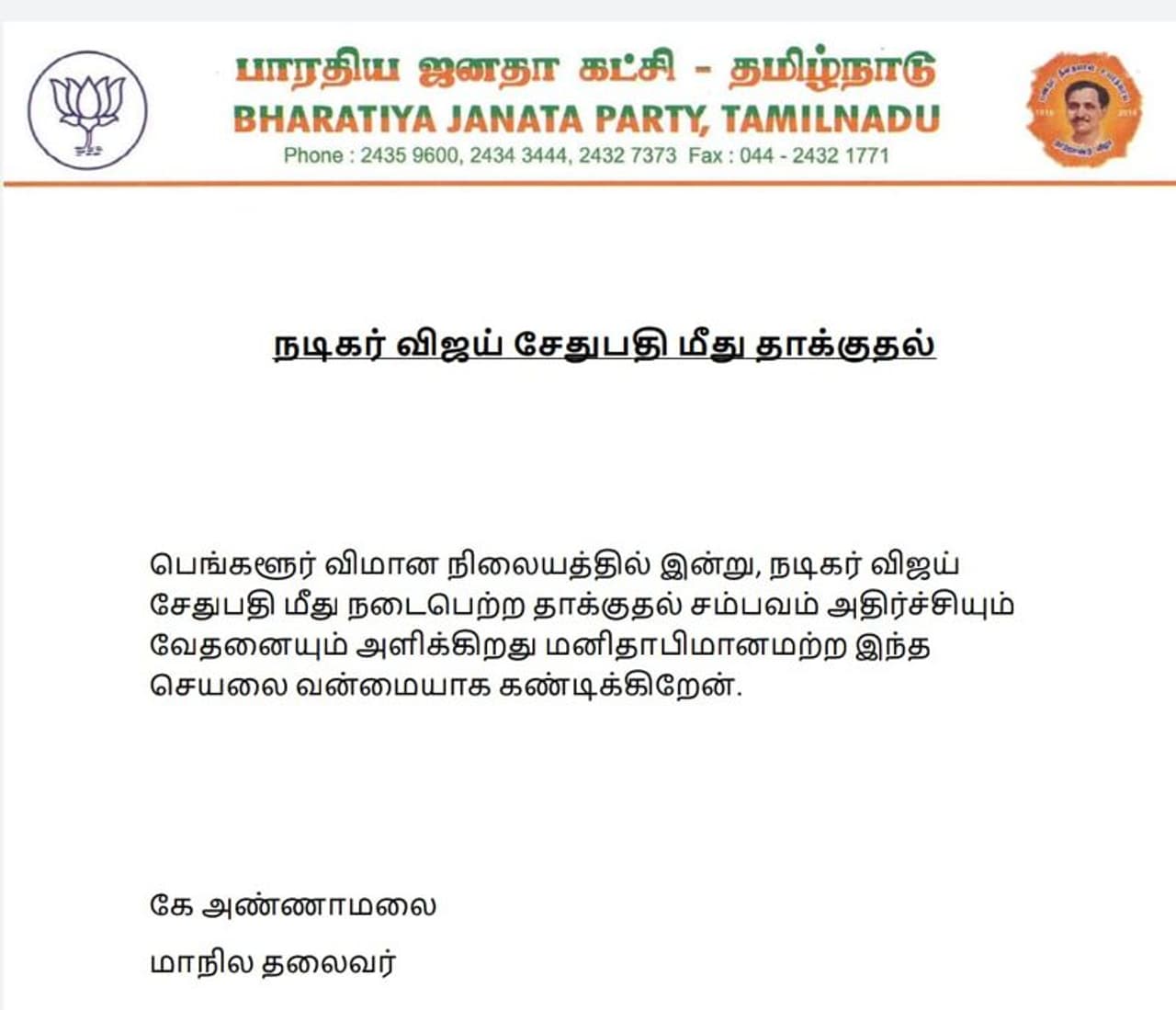 நடிகர் விஜய் சேதுபதி மீது நடத்தப்பட்ட தாக்குதலை வன்மையாக கண்டிப்பதாக தமிழக பாஜக மாநில தலைவர் கே. அண்ணாமலை கண்டனம் தெரிவித்துள்ளார். விஜய் சேதுபதி மீது ஒரு பொது இடத்தில் தாக்குதல் நடத்தப்பட்டு இருப்பது அதிர்ச்சியும் வேதனையும் அளிக்கிறது என்றும் அவர் கூறியுள்ளார். லேட்டா வந்தாலும் லேட்டஸ்டா வந்ததை போல தமிழ் சினிமாவுக்கு காலம் கடந்து வந்திருந்தாலும் ரசிகர்கள் மத்தியில் கனகச்சிதமாக இருக்கை போட்டு அமர்ந்தவர் யார் என்று கேட்டால் நடிகர் விஜய்சேதுபதி என்றே சொல்லலாம். குறிப்பாக அதிக பெண் ரசிகர்களைக் கொண்டவராகவும், குறுகிய காலத்தில் படு பிசியாக ஹீரோவாக வலம் வருகிறார் விஜய் சேதுபதி. வில்லன், ஹீரோ, துணை கேரக்டர் என எந்த கதாபாத்திரத்தை கொடுத்தாலும் அதில் தனக்கென தனி முத்திரையை பதித்து தமிழ்ச்சினிமாவில் கலக்கு கலக்கு என கலக்கி வருகிறார் அவர்.