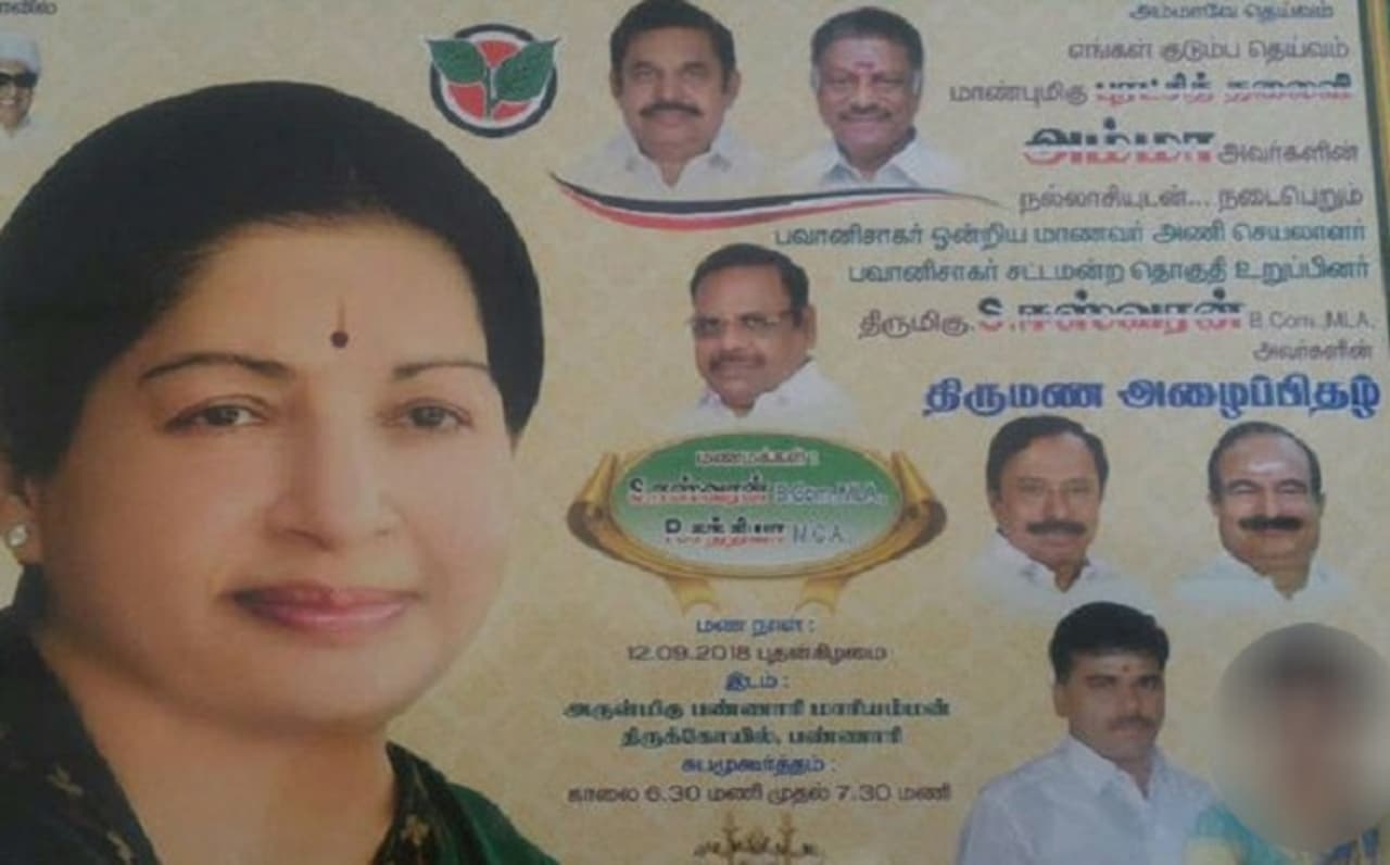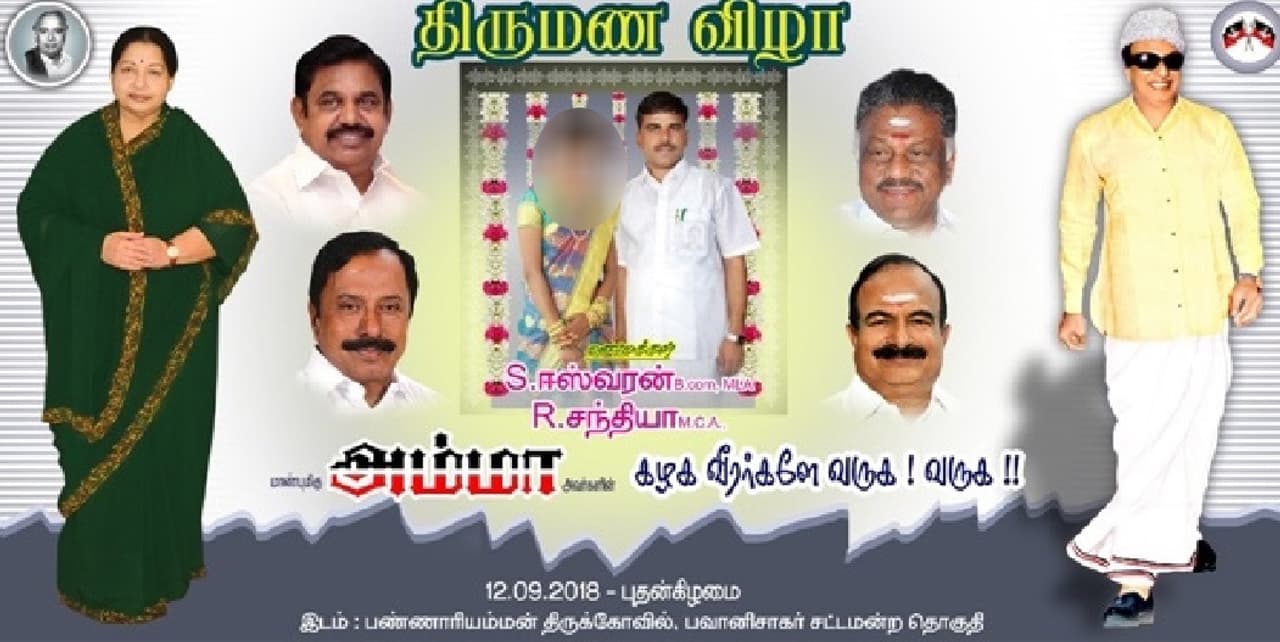 முதலமைச்சர் எடப்பாடிபழனிசாமி, துணைமுதலமைச்சர் ஓபிஎஸ் மற்றும்அமைச்சர்கள்முன்னிலையில்பண்ணாரிஅம்மன்கோவிலில்திருமணம்நடக்கஇருந்தது.திருமணஏற்பாடுகள்தீவிரமாக நடந்தது. உறவினர்களுக்குபத்திரிகைகொடுக்கப்பட்டுஅழைப்புவிடுக்கப்பட்டது.