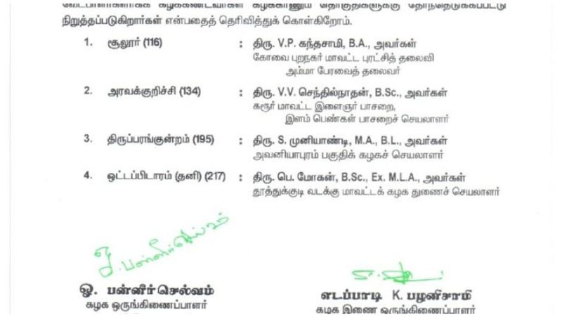தமிழகத்தில் மே 19 அன்று திருப்பரங்குன்றம், அரவக்குறிச்சி, ஒட்டப்பிடாரம், சூலூர் ஆகிய தொகுதிகளில் இடைத்தேர்தல் நடைபெற உள்ளது. இந்தத் தேர்தலில் போட்டியிடும் அதிமுக வேட்பாளர்கள் நேற்று அறிவிக்கப்பட்டனர். இந்த நான்கு தொகுதிகளுக்கும் வேட்பாளர்களை அறிவிக்க அதிமுக தலைமை திணறியதாக தகவல் வெளியாகியுள்ளது. அமைச்சர்கள் பலரும் வேட்பாளர்களை அறிவிப்பதில் முட்டுக்கட்டை போட்டதால், வேட்பாளர்களை இறுதி செய்வதில் கட்சித் தலைமைக்கு சிக்கல் ஏற்பட்டதாகவும் கூறப்படுகிறது.