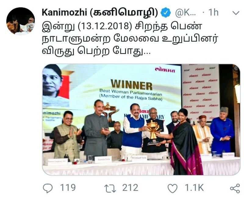 சிறந்தநாடாளுமன்றஉறுப்பினர்விருதுபெறும்புகைப்படத்தைகனிமொழிதனதுடுவிட்டர்பக்கத்தில்பகிர்ந்துள்ளார்.