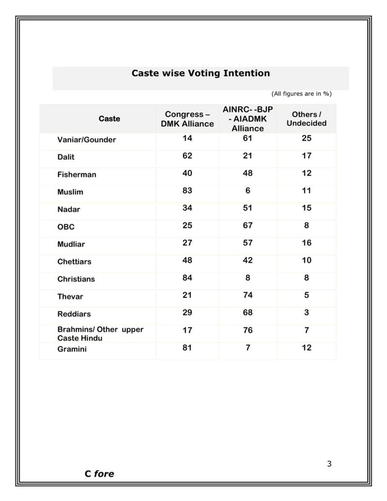 நாடார் சமூகத்தினர் 51% பேரும், முதலியார் சமூகத்தினர் 51% பேரும், தேவர் சமூகத்தினர் 74 சதவீதம் பேரும், ரெட்டியார் சமூகத்தினர் 68 சதவீதம் பேரும், பிராமணர் உள்ளிட்ட முன்னேறிய சமூகத்தினரின் 76 சதவீதம் பேரும் அதிமுக-பாஜக- என்ஆர் காங்கிரஸ் கூட்டணிக்கு வாக்களிப்பர் என கருத்துக்கணிப்பில் தெரியவந்துள்ளது. இதன் மூலம் அதிமுக- பாஜக-என் ஆர் காங்கிரஸ் கூட்டணி வெற்றி உறுதி செய்யப்பட்டுள்ளது என கருத்துக் கணிப்பில் தெரிய வந்துள்ளது.